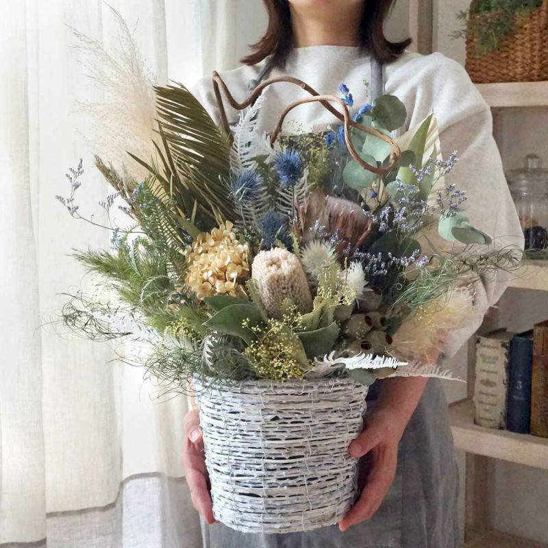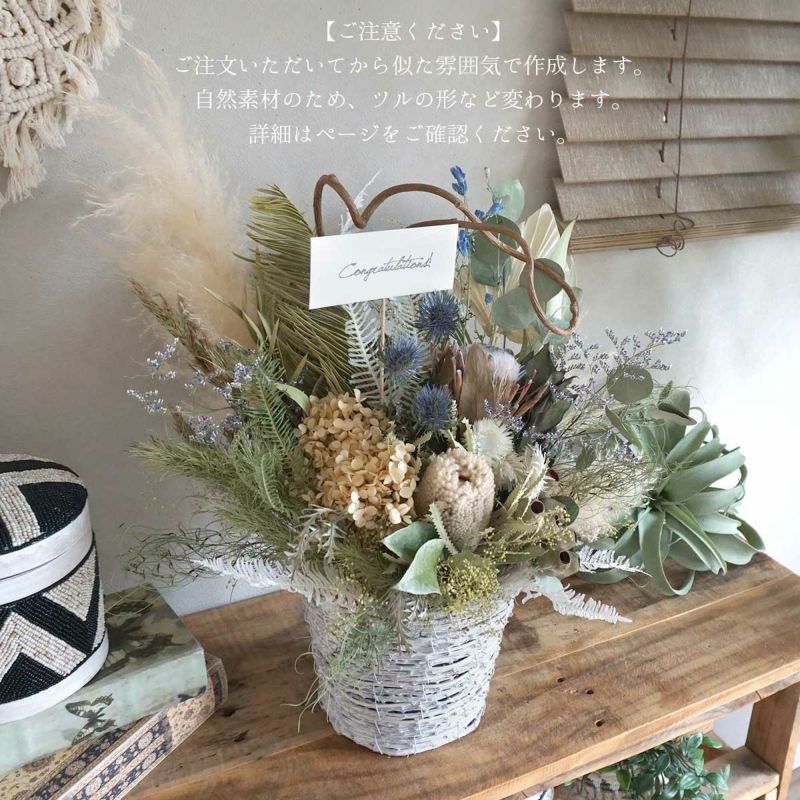 爽やかなボタニカルテイストのアレンジに仕上げました。サイズは大きめの縦60×横40cm程度。バンクシア、プロテア、パンパスグラス、ソテツなど豪華な花材を使用しています。置くだけで簡単にすぐ飾っていただます。立札やメッセージカードも無料でお付けできますので、開店祝い・開業祝い・新築祝い・結婚祝いなどにおすすめです。ご注文いただいてから、似たようなアレンジでお作りいたします。