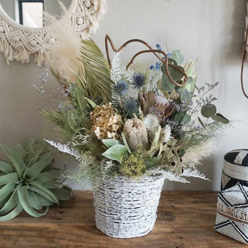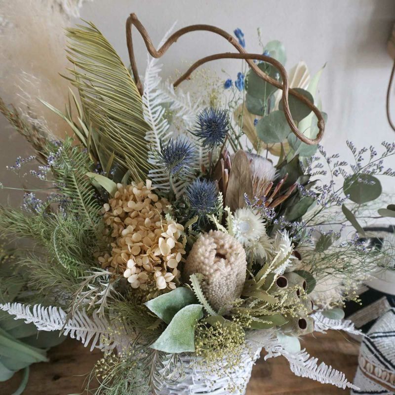 こちらのアレジメントは、バンクシアやユーカリ、プロテアなどを使用して