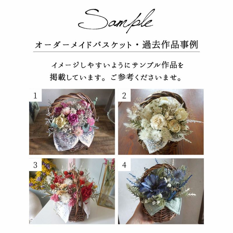 世界に一つだけのドライフラワーバスケットアレンジ。サイズが大きくなって、お祝いにぴったり!お客様のご希望に合わせてお作りします。配送前に写真もお送りしているので、直送のプレゼントでも安心です。誕生日・開店祝い・引っ越し祝い・結婚祝い・記念日のお祝いにもおすすめ!