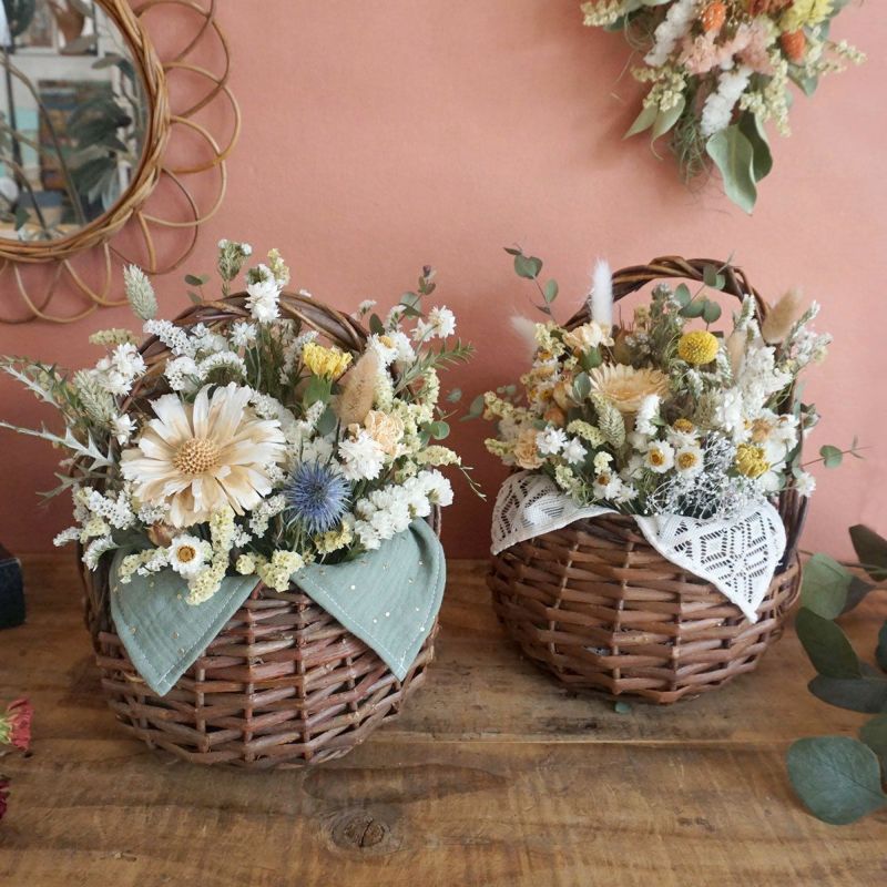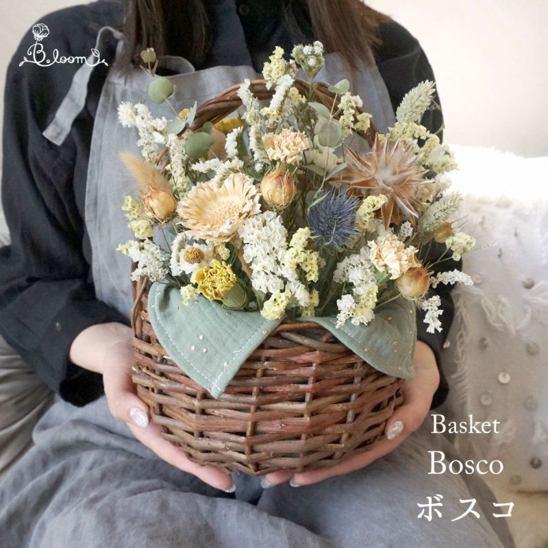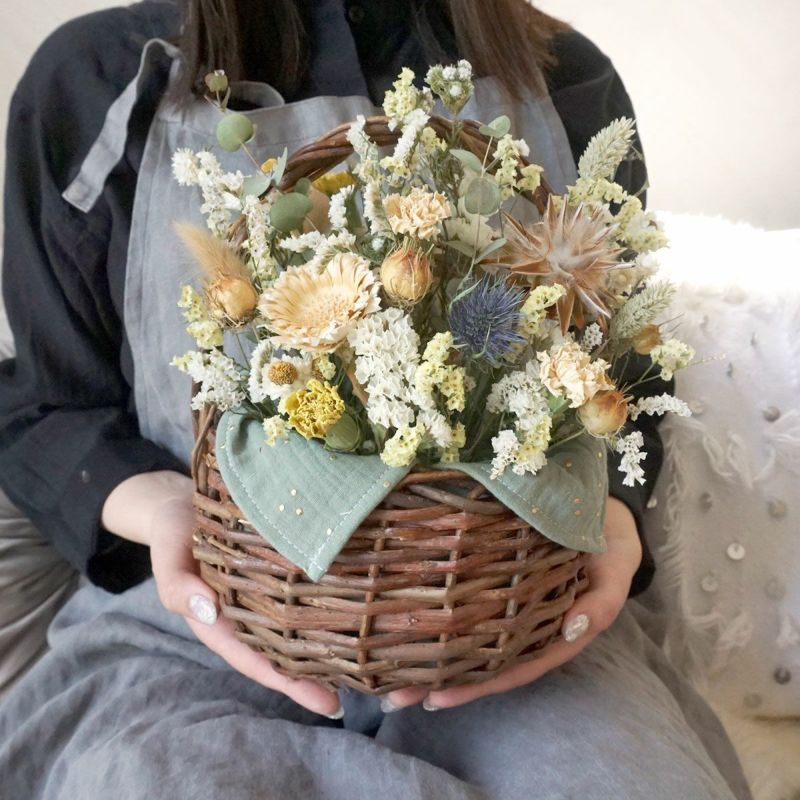 開店祝いや誕生日プレゼント、結婚祝いにおすすめなナチュラルでおしゃれなドライフラワーバスケット。バスケット内の生地もお好みのものをお選びいただけます。ドライフラワーバスケットは置くだけでインテリアになるので、簡単にお花をお楽しみいただけます。無料でクリアフィルムラッピングもしていますので、ぜひプレゼントにご検討くださいませ。