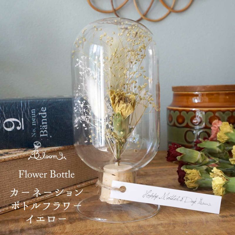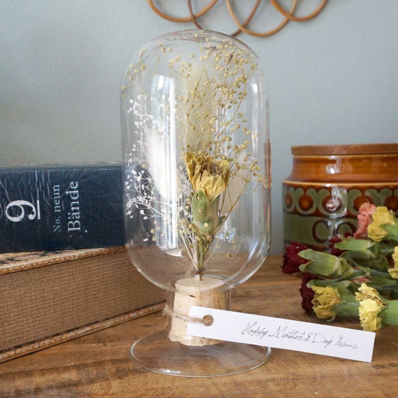 ガラスボトルの中に当店で生花からドライフラワーに加工したカーネーションやソフトカスミソウ、ラグラスを入れました。ボトルなので置いていただくだけで、簡単に飾っていただけます。散りにくいのでお手入れも簡単です。親しい友人や恋人、ご家族へ気持ちを込めたプレゼントにいかがでしょうか?