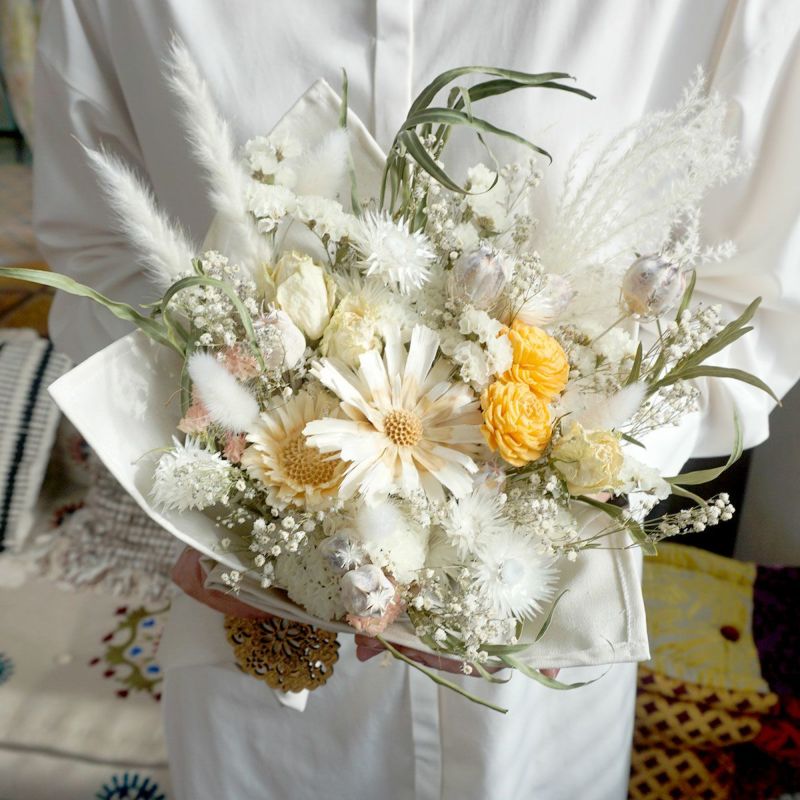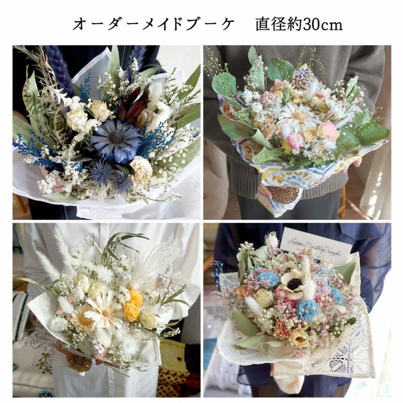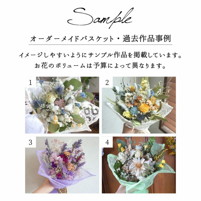 プレゼントにおすすめの世界に一つだけのオーダーメイドブーケ。お好きなイメージや色味でお作りするフルオーダーのブーケです。発送前にお写真を送付して確認いただけます。無料修正も2回まで承っております。誕生日・開店祝い・引っ越し祝い・結婚祝い・記念日のお祝いにもおすすめ!