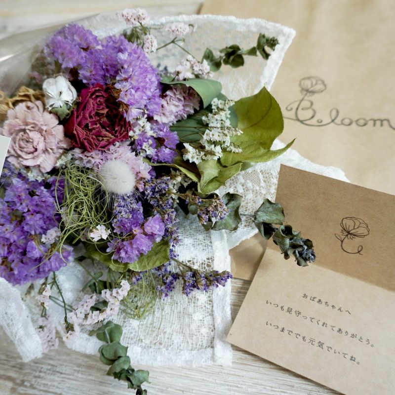 プレゼントにおすすめのブーケ。ピンク×パープルのおカラーがアクセントのエレガントなブーケです。生地のカスタマイズも可能。感謝の気持ちを花束にのせて贈りませんか。