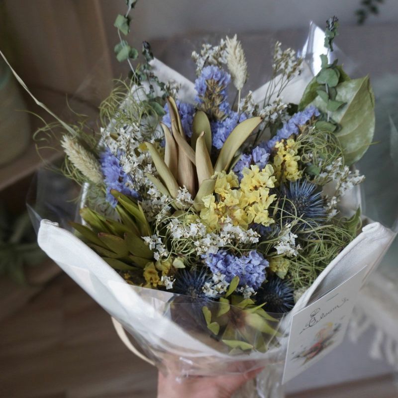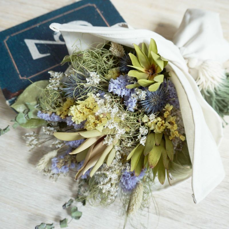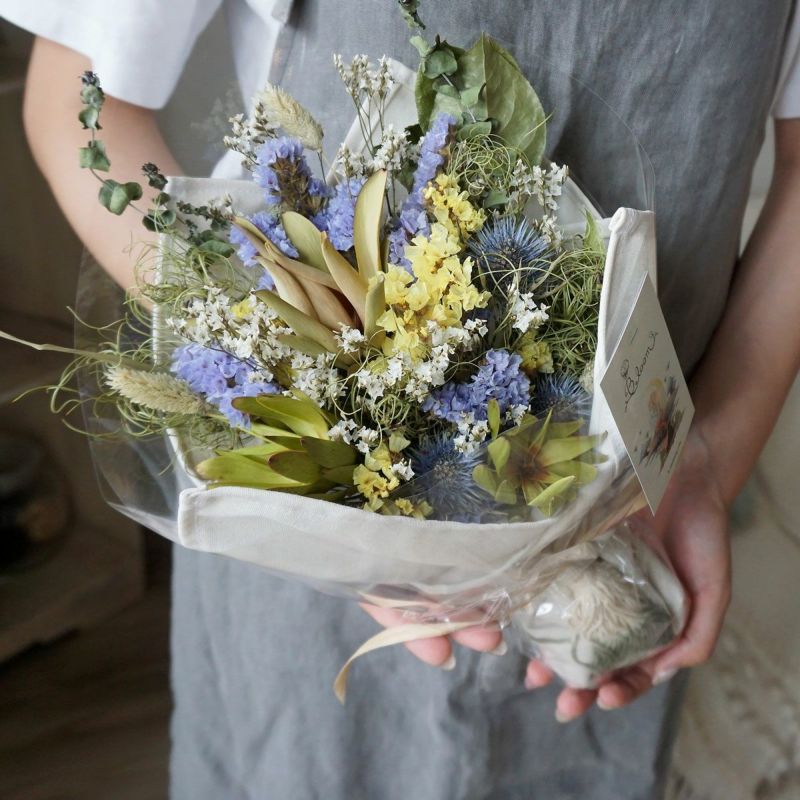 MATERIAL:スターチス、リューカデンドロン、ハイブリットスターチス、ボアプランツ、ゴアナクロー、ユーカリ、エリンジウムなど。