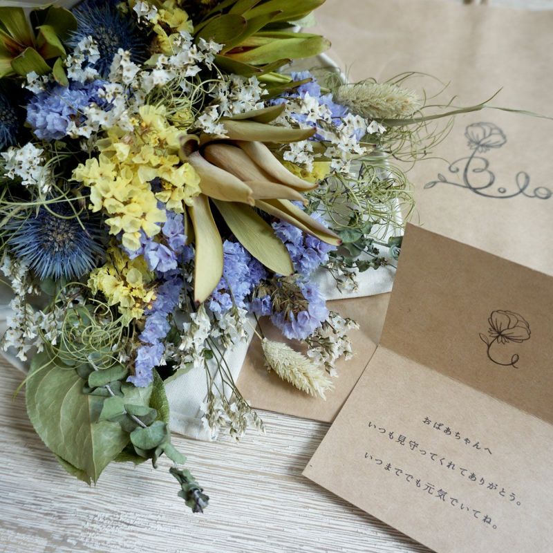 長寿を願う色としてぴったりのイエロー×パープルの爽やかな印象のブーケです。