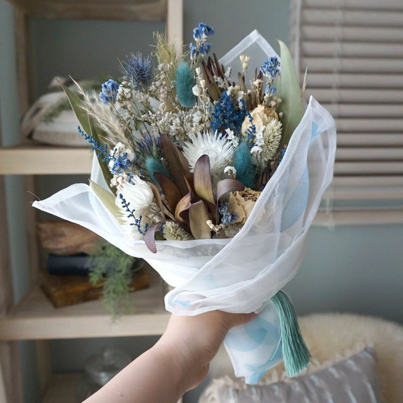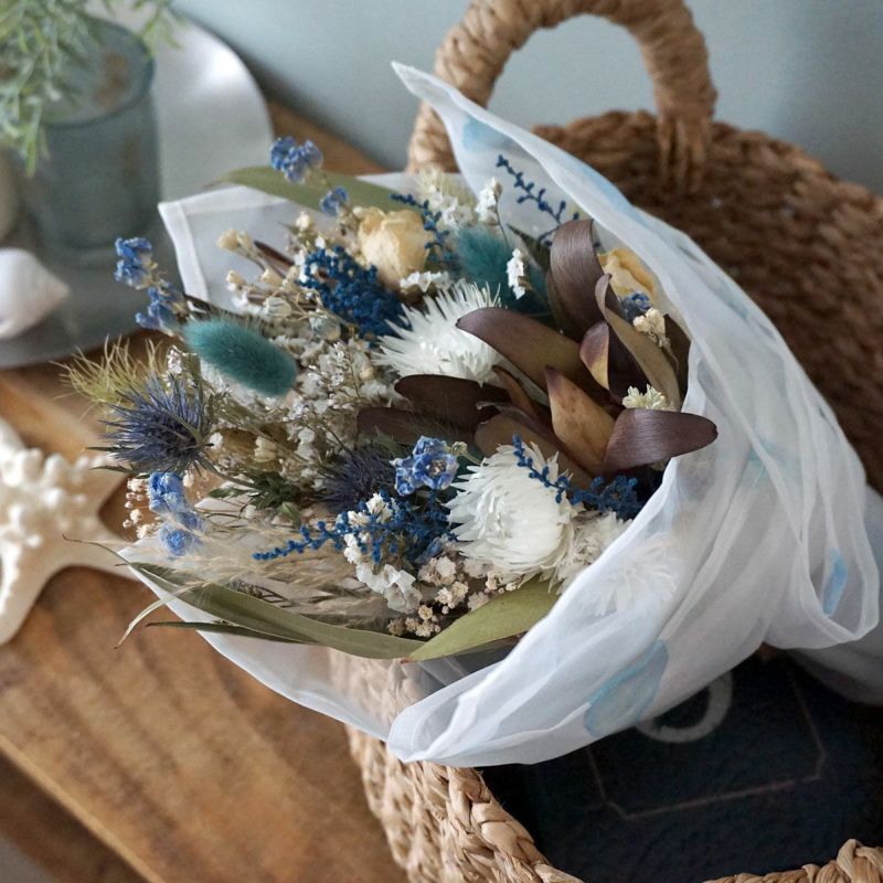 海をイメージしたプレゼントやギフトにおすすめのドライフラワーブーケ。シックな色味でまとめているので男性へのプレゼントにもおすすめです。誕生日・記念日・結婚祝い・開店祝いなどにもおすすめ。贈った後にもおしゃれなインテリアに。