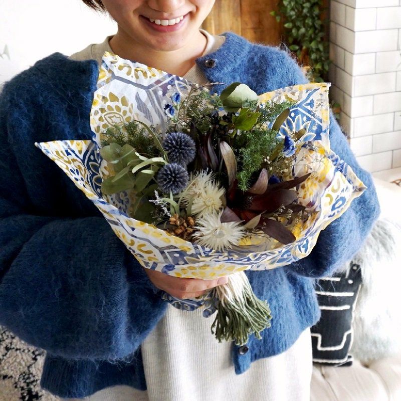 花束に生地やタッセル、チャームなどの装飾を施してラッピングの上発送させていただきます。