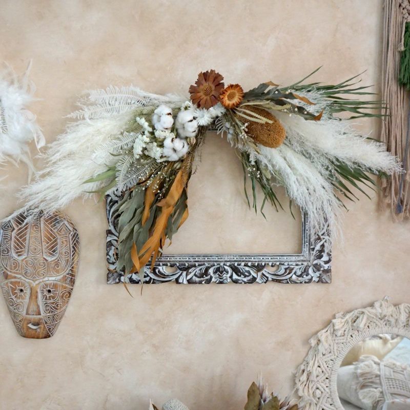 バンクシア、パンパスグラス、エバーラスティング、ユーカリなどをお入れしたボーホースタイルのウォールデコです。