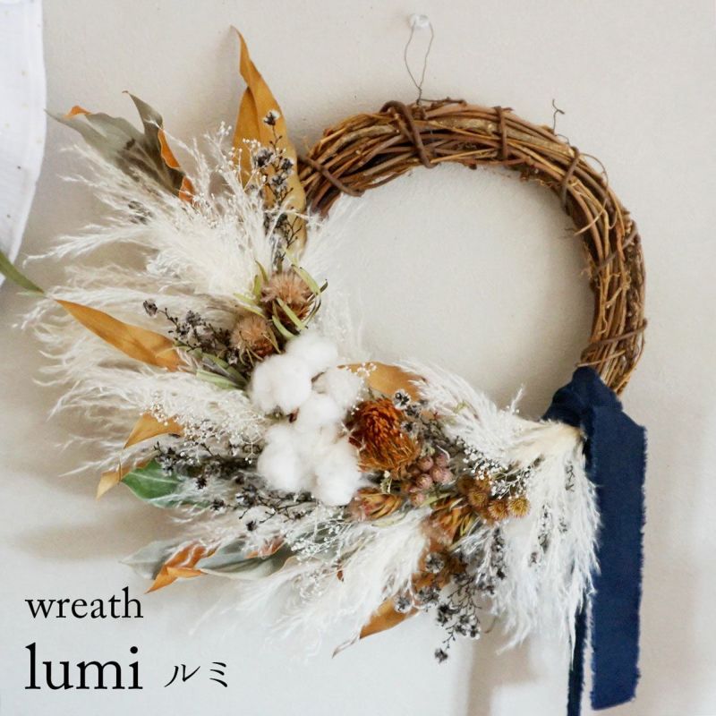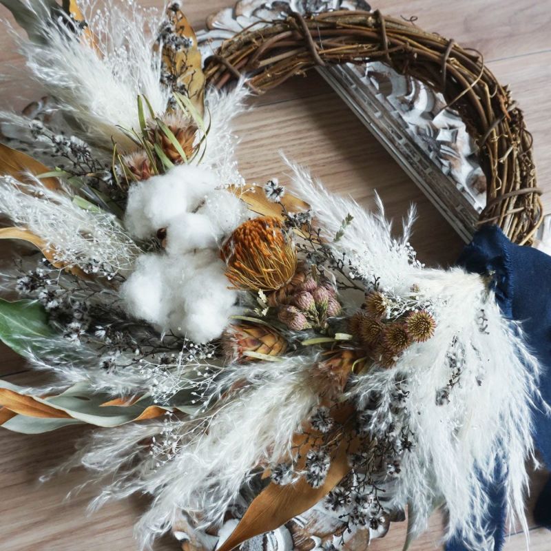 【冬のインテリアにおすすめ!】パンパスグラス、コットン、ドライアンドラを使ったふわふわリースです。やさしく上品な仕上げになっているのでクリスマス以外でも年中お使いいただけます。