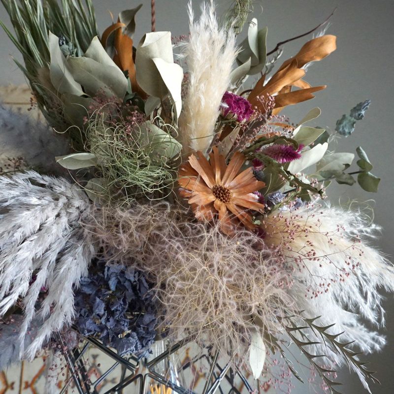 アジサイやパンパスグラス、ユーカリポポラスやスモークツリー、ゴアナクロー、などを使って作成させていただきました。