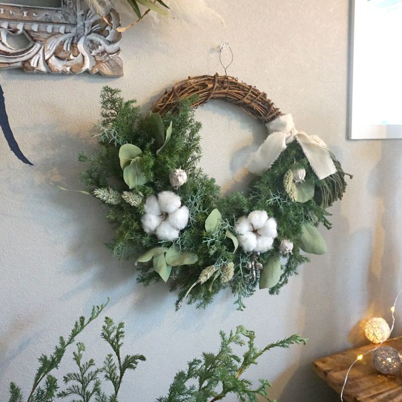プレゼントやギフトにもおすすめ!自然な雰囲気がお好きな方にぴったり。ボタニカルインテリアに合うユーカリやコットン、ヒムロスギを使ったハーフリースです。