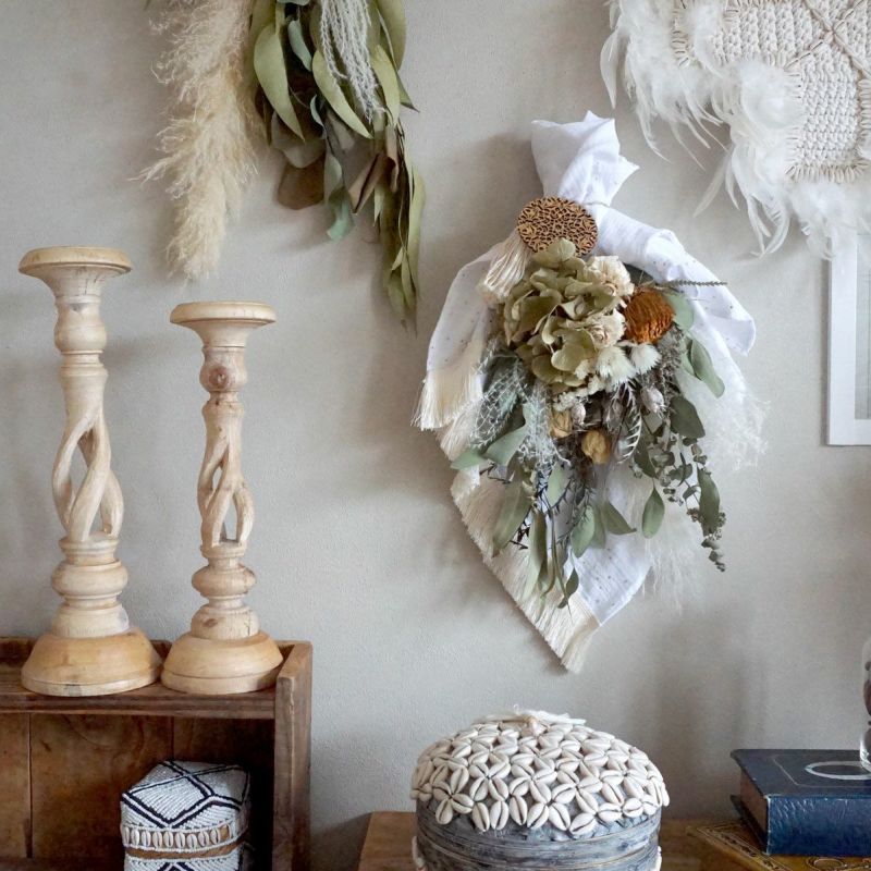 アジサイ、バラ、エバーラスティング、ユーカリ、ドライアンドラ、ススキなどをお入れしたボーホースタイルのスワッグです。きれいめなデザインで、シャビーシックなお部屋にもよく合います。ギフトやちょっとしたプレゼントにもぴったり。メッセージカードをつけて誕生日・記念日・結婚祝いにもおすすめです。