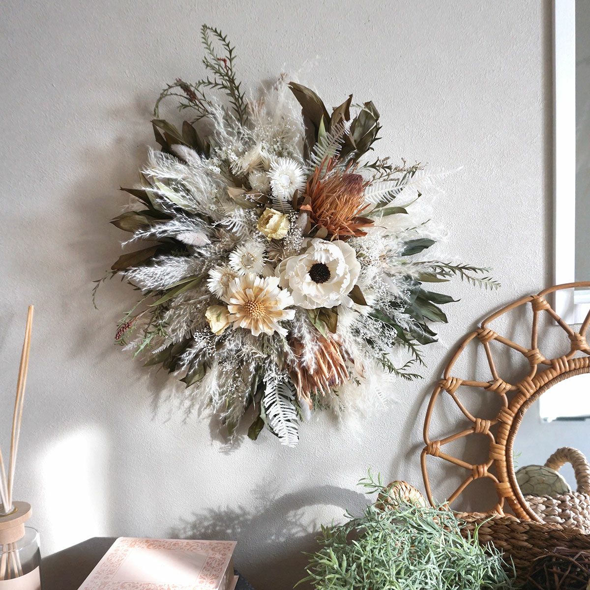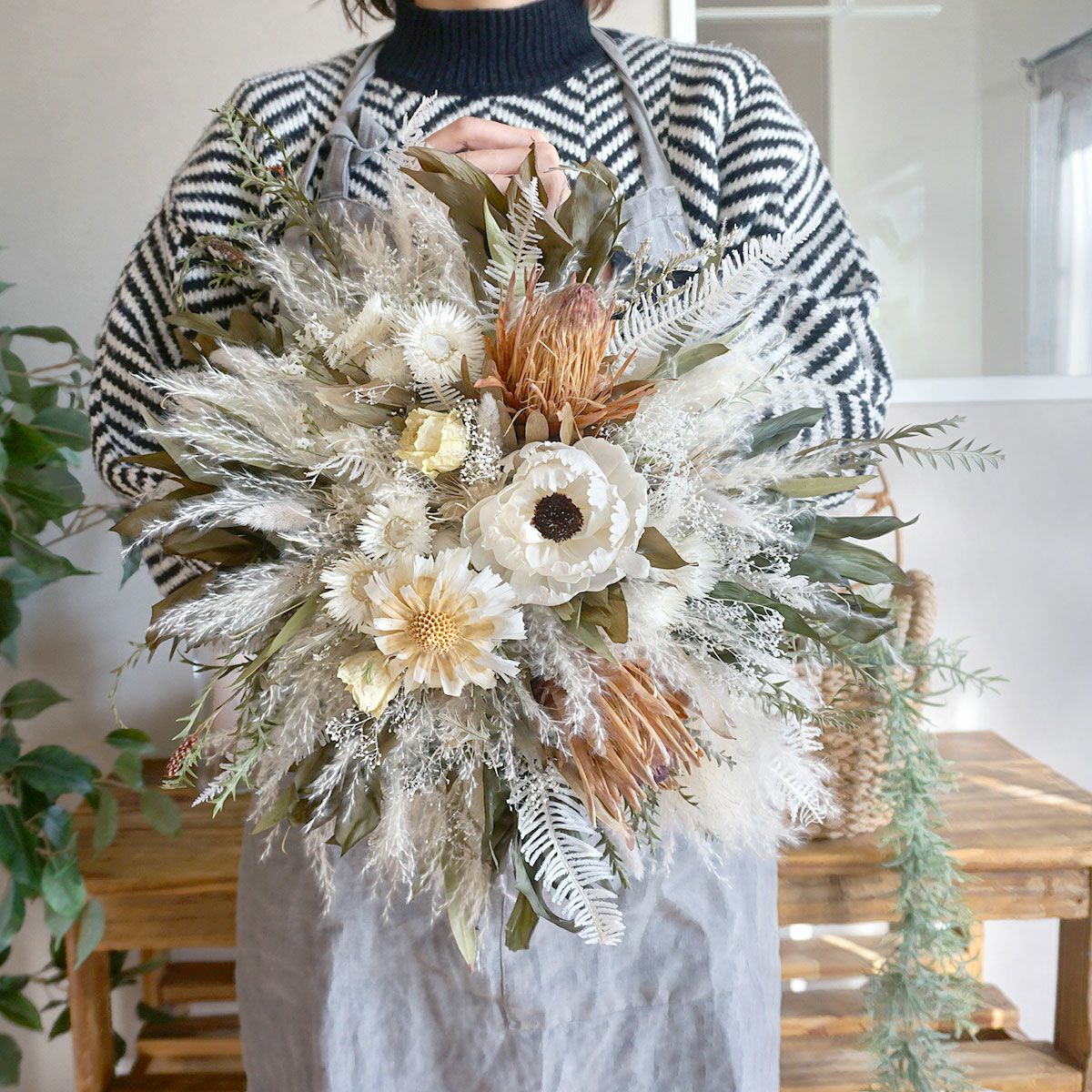お客様からご注文いただいたスワッグやブーケの作成を主に行っております♪