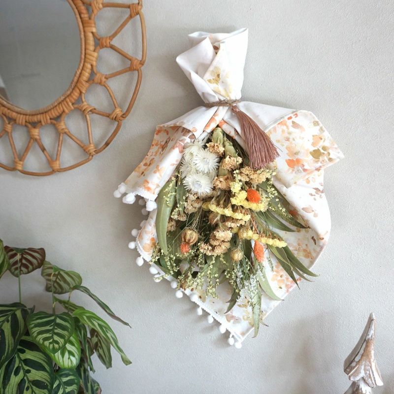 気花束を生地、ブレード、チャーム、巻き方などをお客様のお好みに合わせてアレンジ可能。