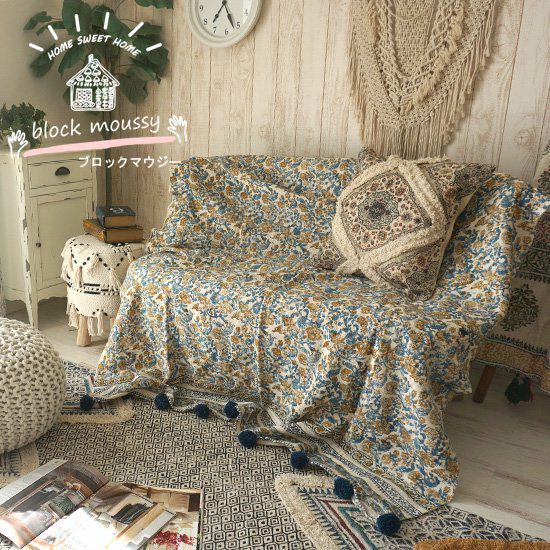 ハンドメイドのブロックプリントが可愛いマルチクロス。ブランケットやソファカバー、ベットスプレットにもおすすめ。