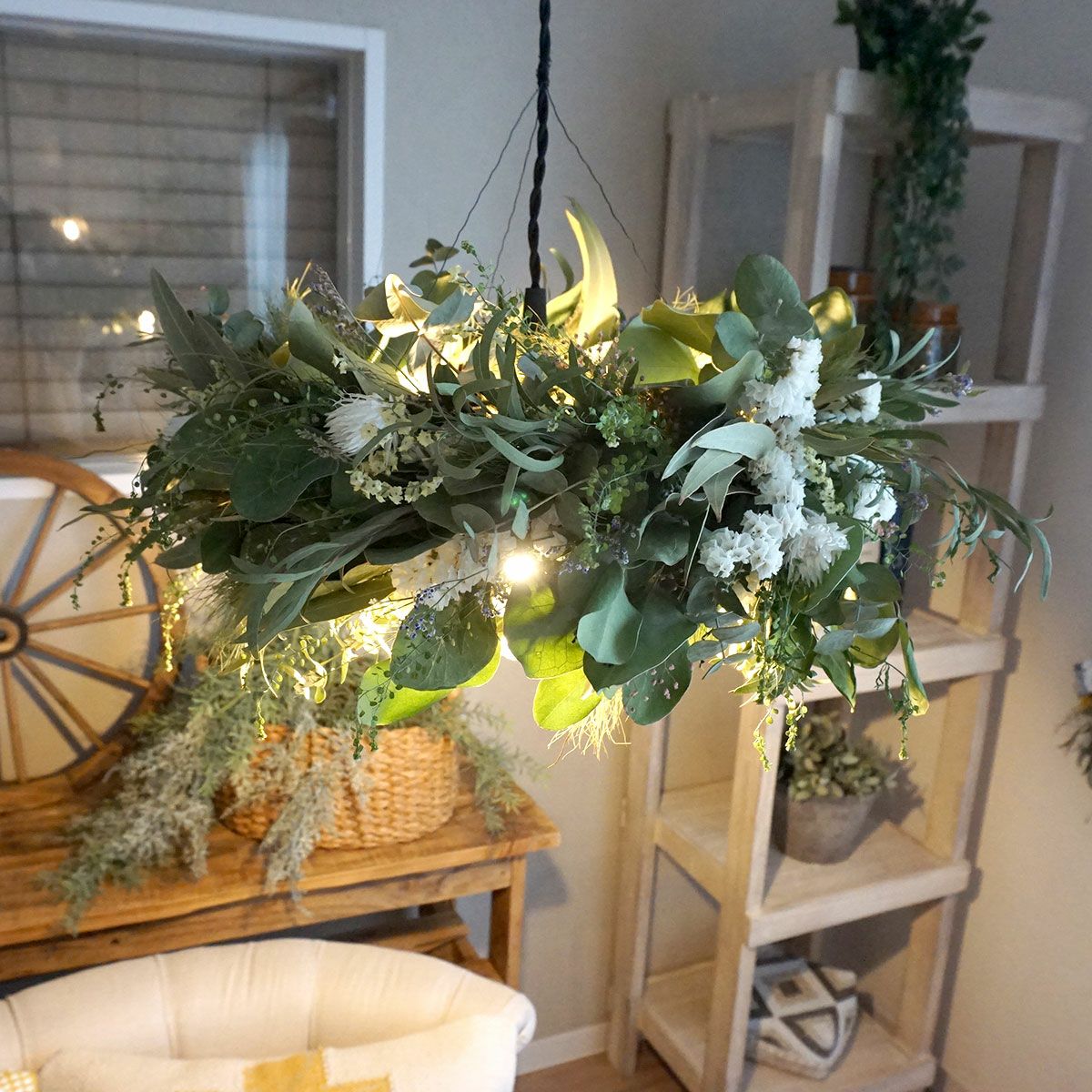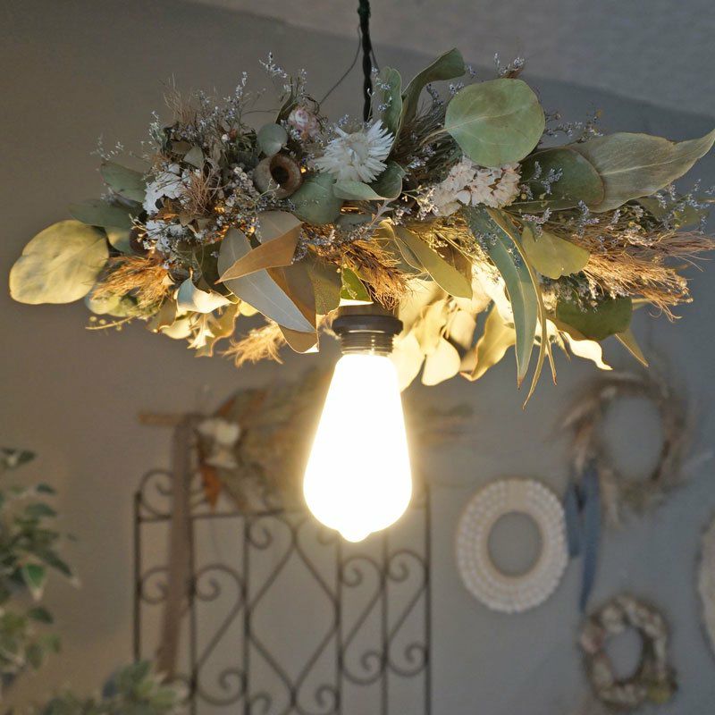 他の画像を見る 【ドライフラワー照明・1灯式ペンダントライト(直径約45cm)】ユーカリ・スターチス<ティアラ> 販売価格 ¥ 26,400 税込 サロンやカフェなどの店内装飾・ディスプレイやお部屋のインテリアにおすすめなドライフラワー照明。グリーンをメインにスターチス、ソフトカスミソウ、ハイブリットスターチスなどお入れして、まるでガーデンで草花をつんできて作られた様なデザインがポイントです。 詳細を見る お気に入りに登録する