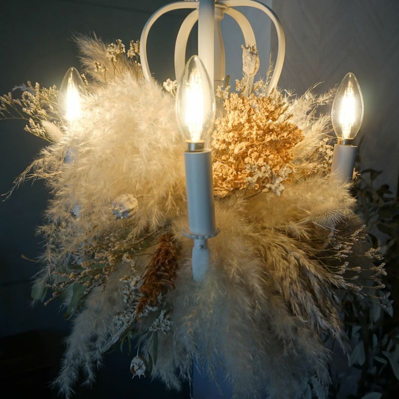 シャンデリアにふわふわなパンパスとドライフラワーをあしらいました。サロンやカフェなどの店内装飾・ディスプレイやお部屋のインテリアに。おしゃれなドライフラワー照明・シャンデリア・ライトは、開店祝いや新築祝い、プレゼントギフトなどにおすすめです。