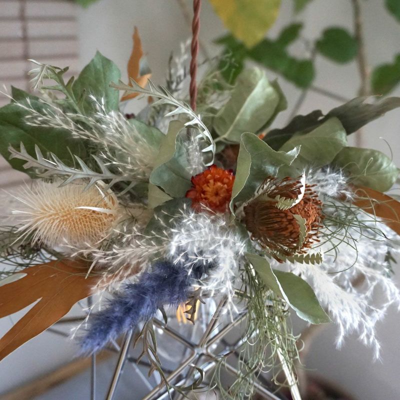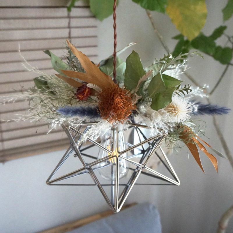 星形の照明にパンパスグラス・ドライアンドラ・ヘリクリサム・レモンリーフなどをあしらった照明です。