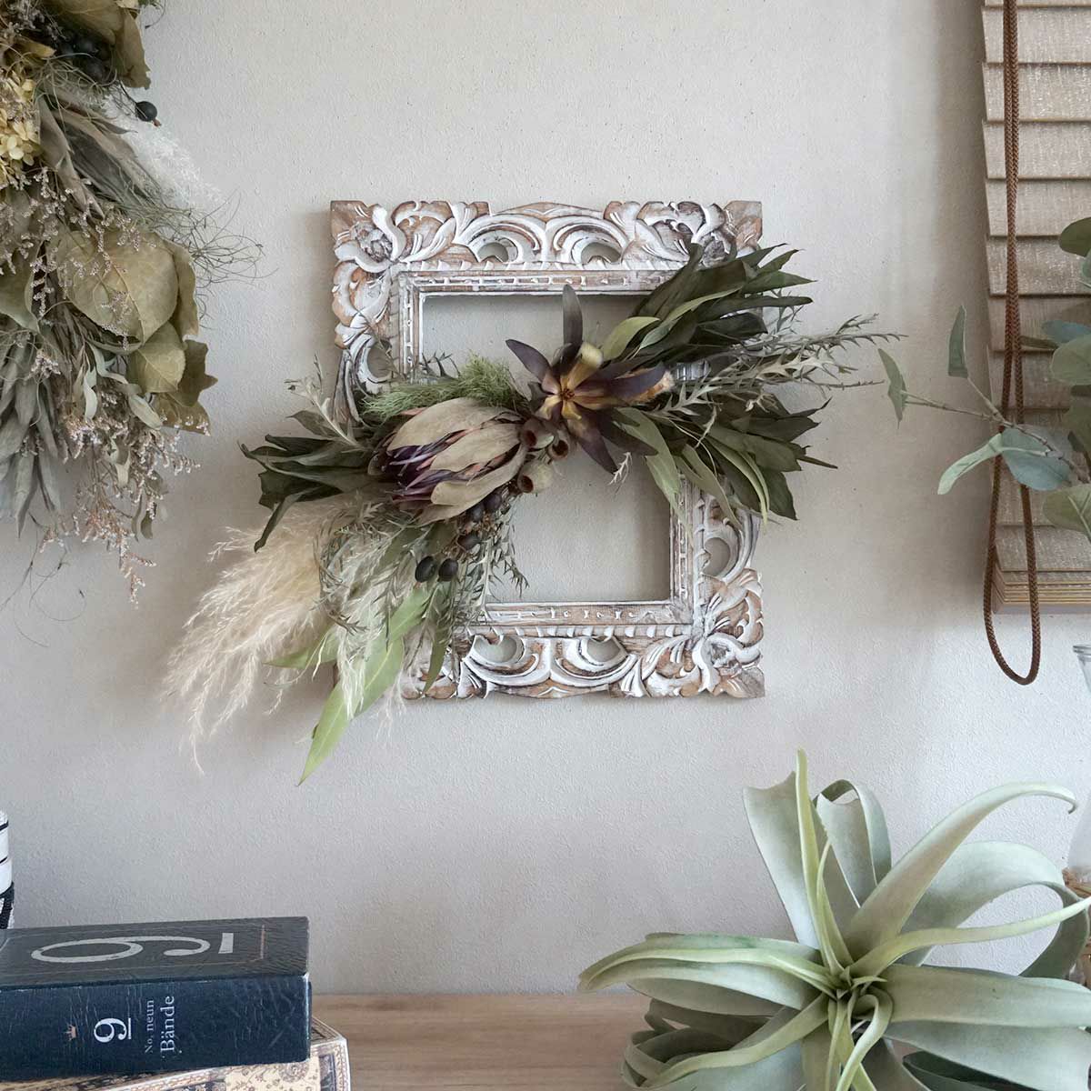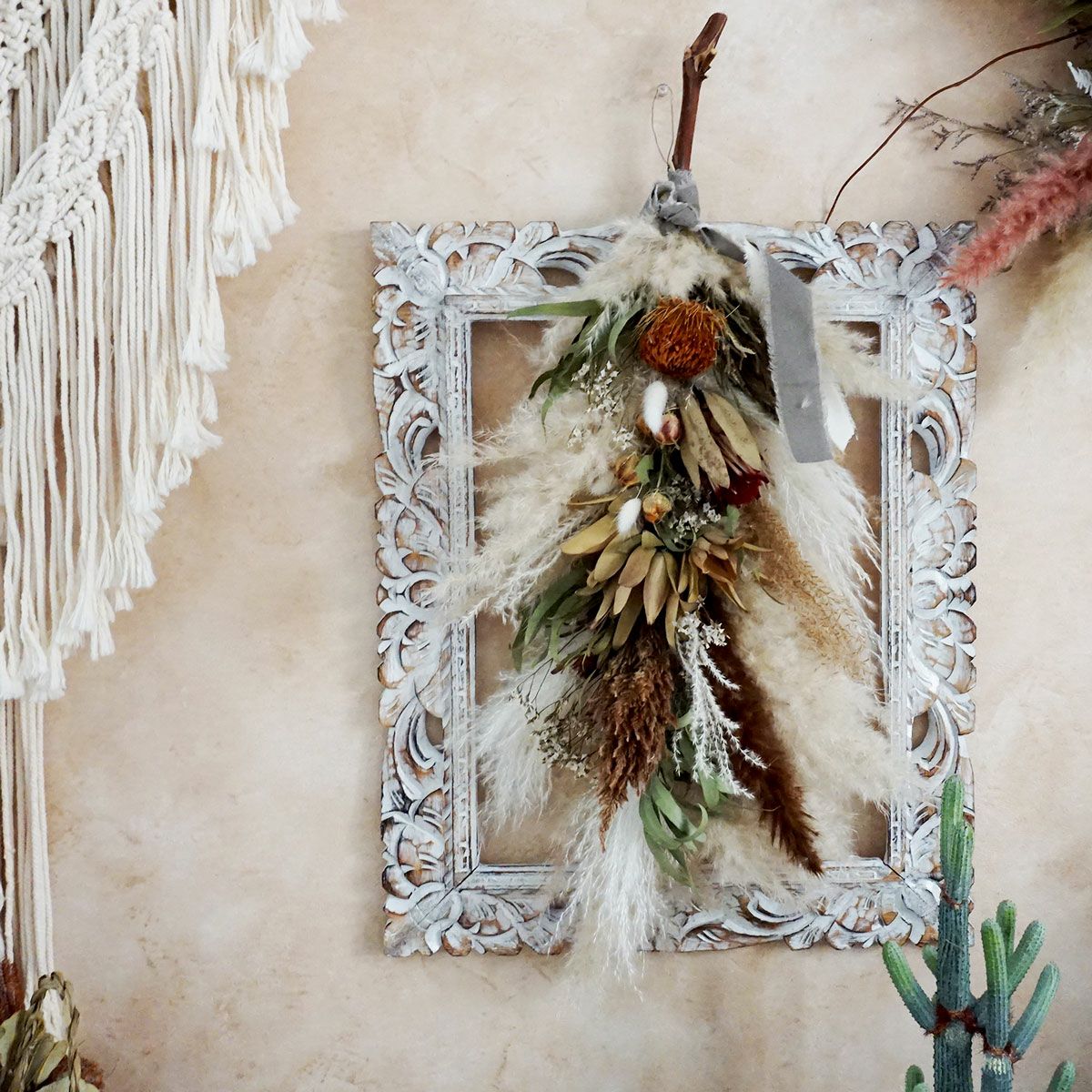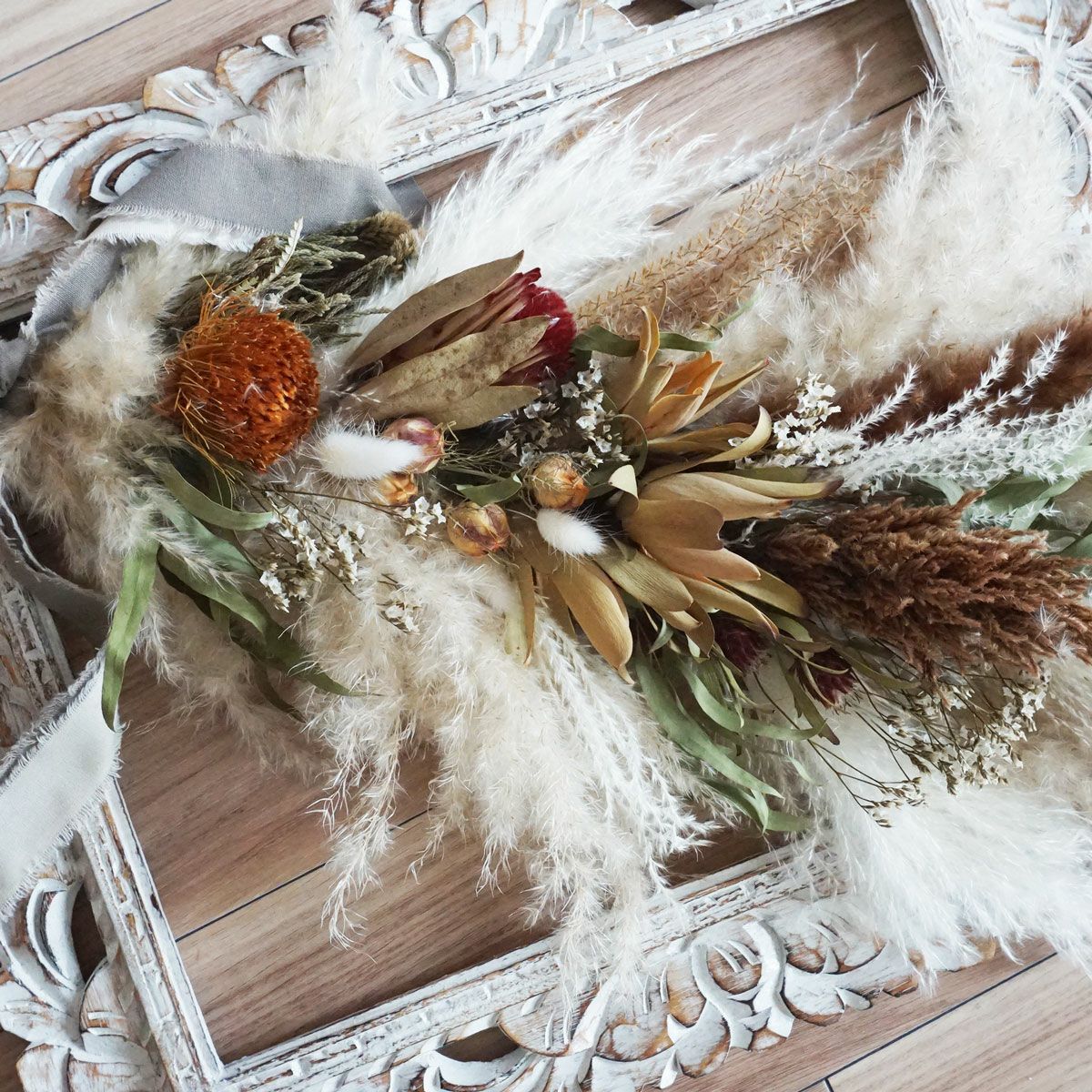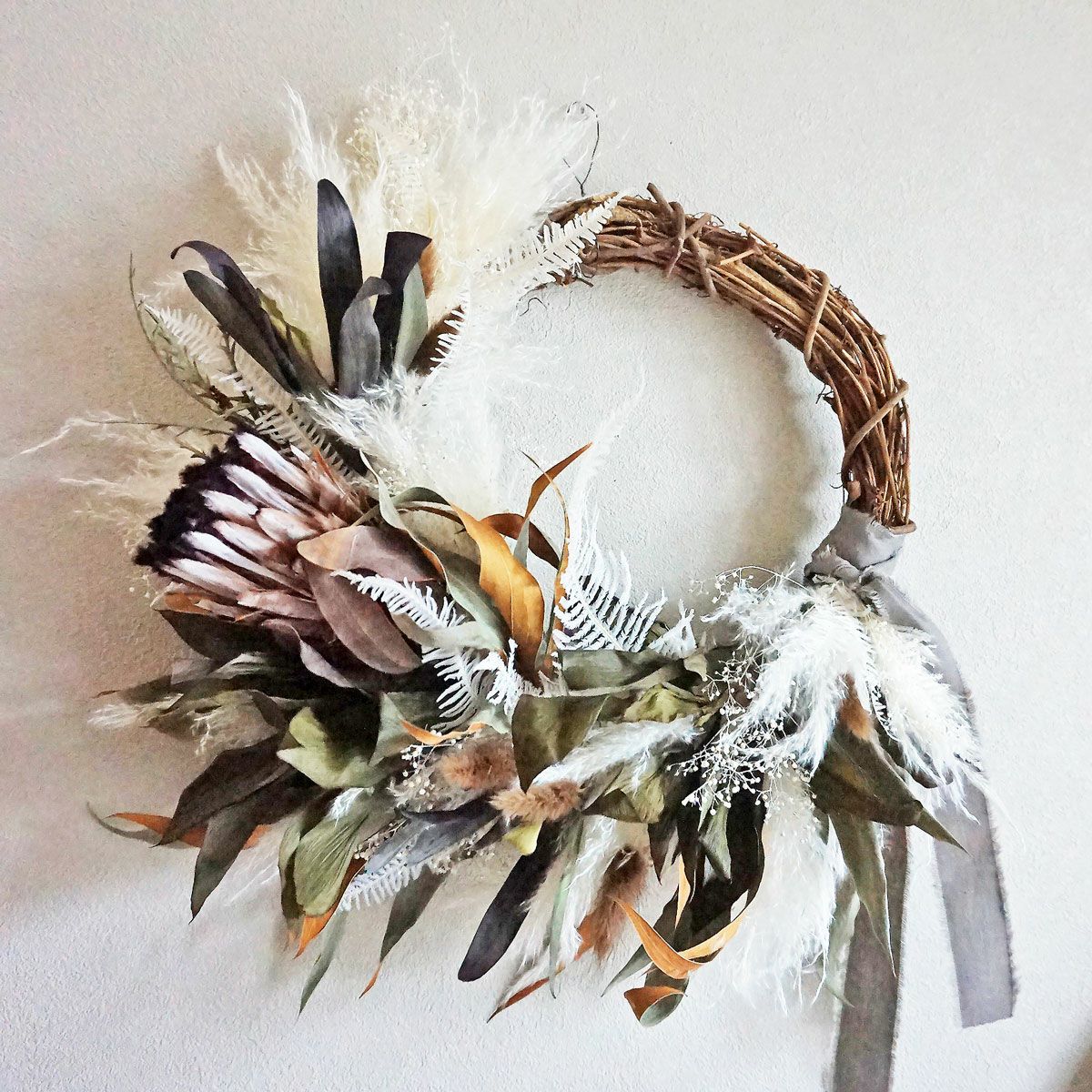 他の画像を見る 【BOHO DESIGN】パンパスグラスやプロテアが入ったビッグリース<ヒッピー> 販売価格 ¥ 39,600 税込 パンパスグラスやプロテアな豪華な花材を使用したビッグリースです。ボヘミアンな雰囲気はボーホースタイルのお部屋にぴったり!ギフトや開店祝いなどにもおすすめです。 詳細を見る お気に入りに登録する