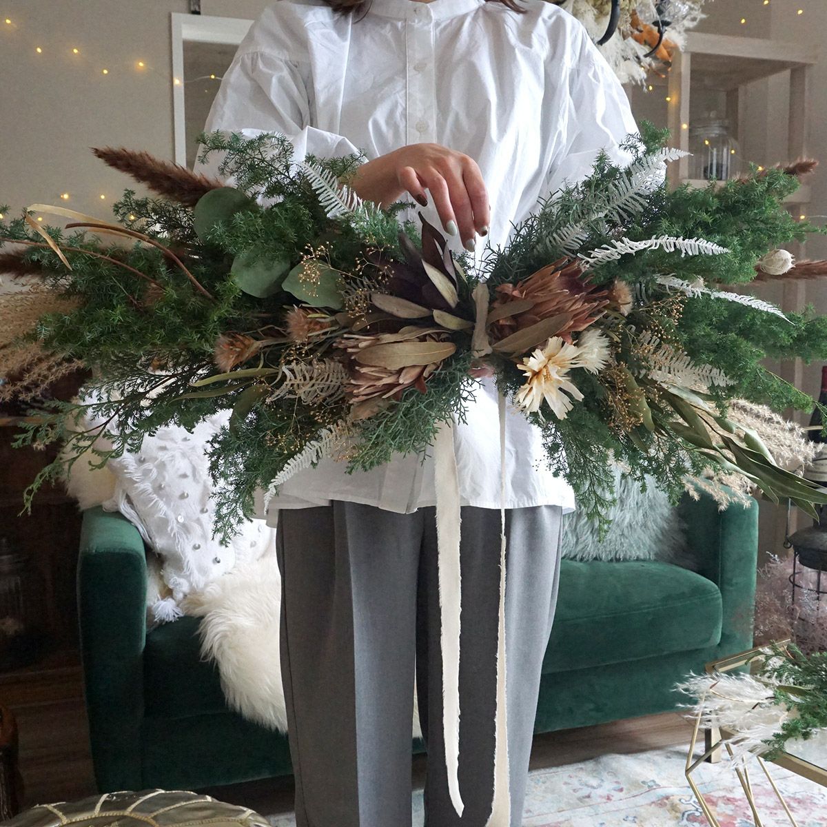他の画像を見る 【クリスマスや冬のインテリアにおすすめ】ヒムロスギやコットンを使った大きめサイズのウォールデコレーション・壁飾り<オーナメント> 販売価格 ¥ 25,300 税込 開店祝いや店内装飾、インテリアにおすすめなドライフラワー壁飾り。コットンとヒムロスギ、プロテア、リューカデンドロンなどを使ってボタニカルテイストに仕上げました。クリスマスのインテリアにおすすめです。 詳細を見る お気に入りに登録する