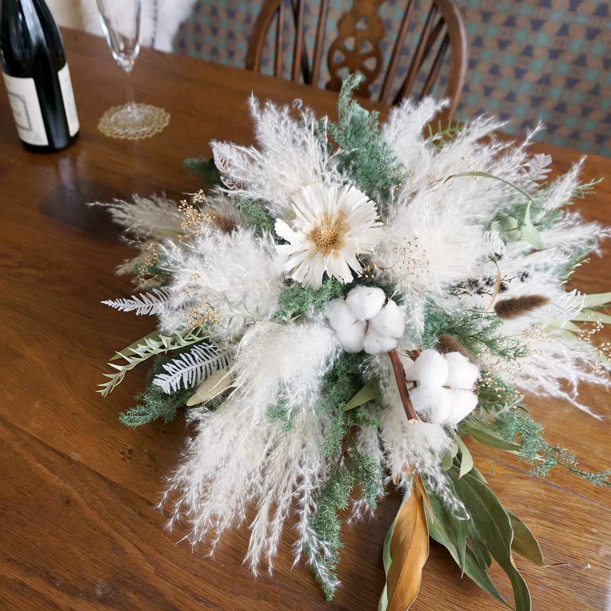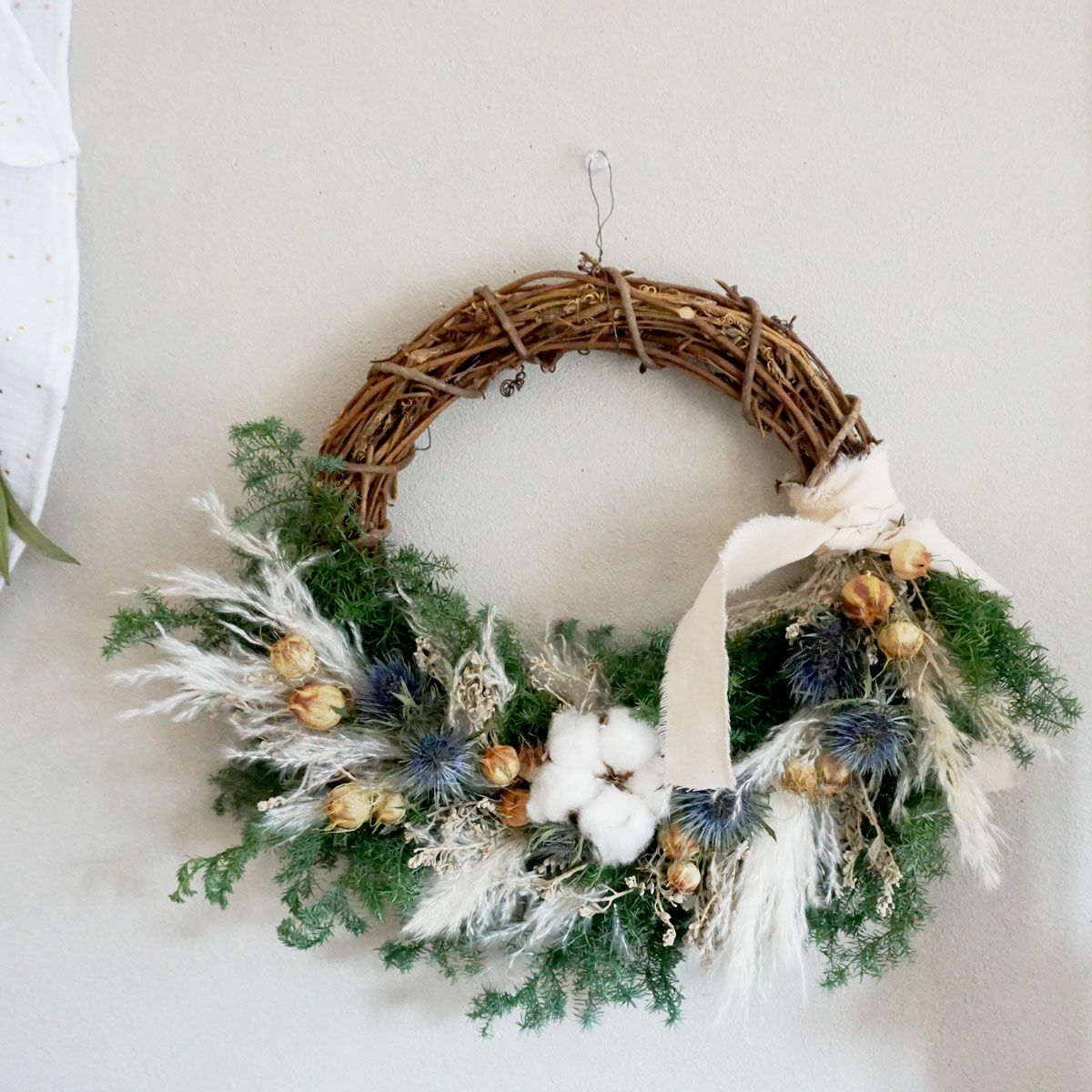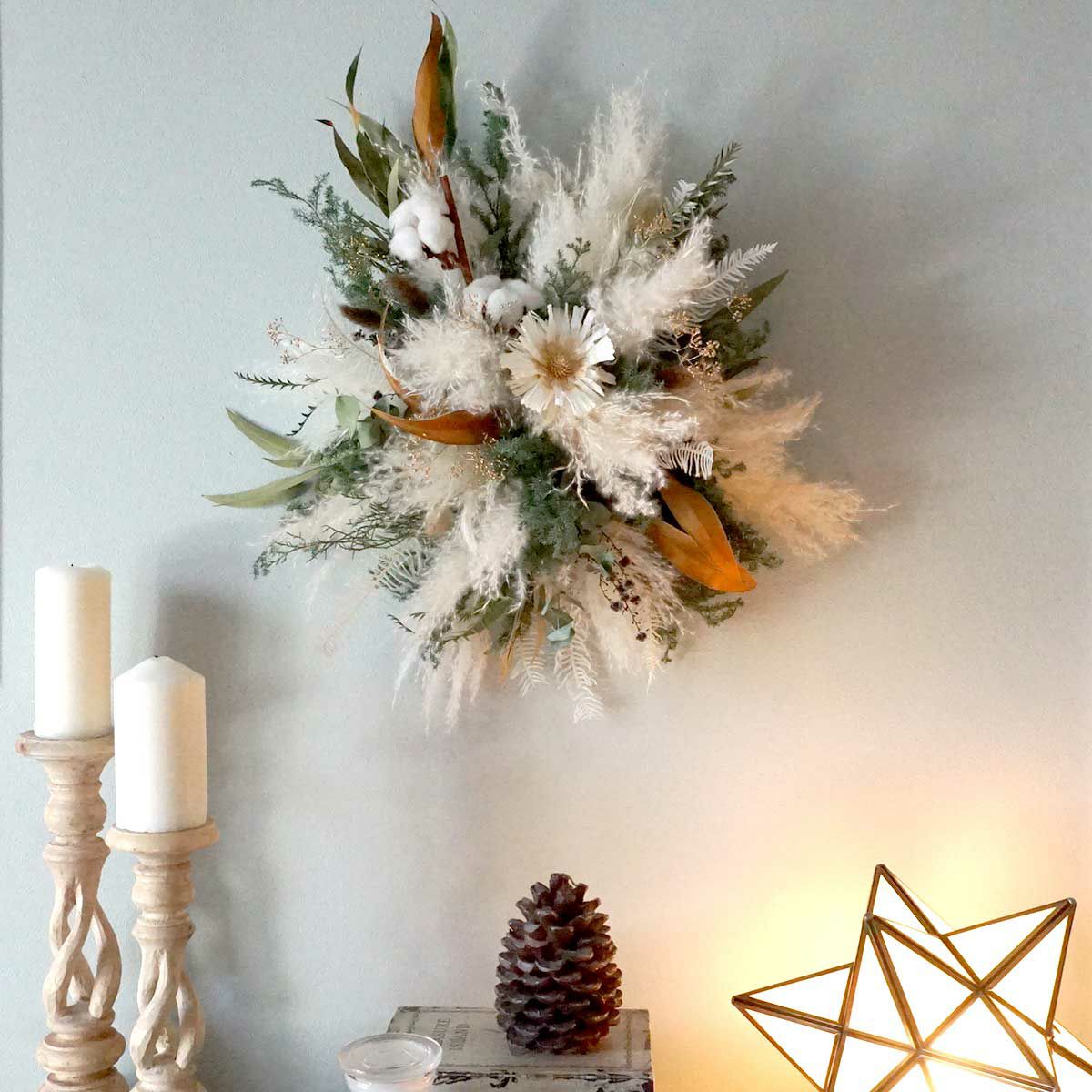 他の画像を見る 【クリスマスや冬のインテリアにおすすめ】パンパス、コットン、ドライアンドラを使ったふわふわリース<ルミ> 販売価格 ¥ 12,100 税込 【冬のインテリアにおすすめ!】パンパスグラス、コットン、ドライアンドラを使ったふわふわリースです。やさしく上品な仕上げになっているのでクリスマス以外でも年中お使いいただけます。 詳細を見る お気に入りに登録する