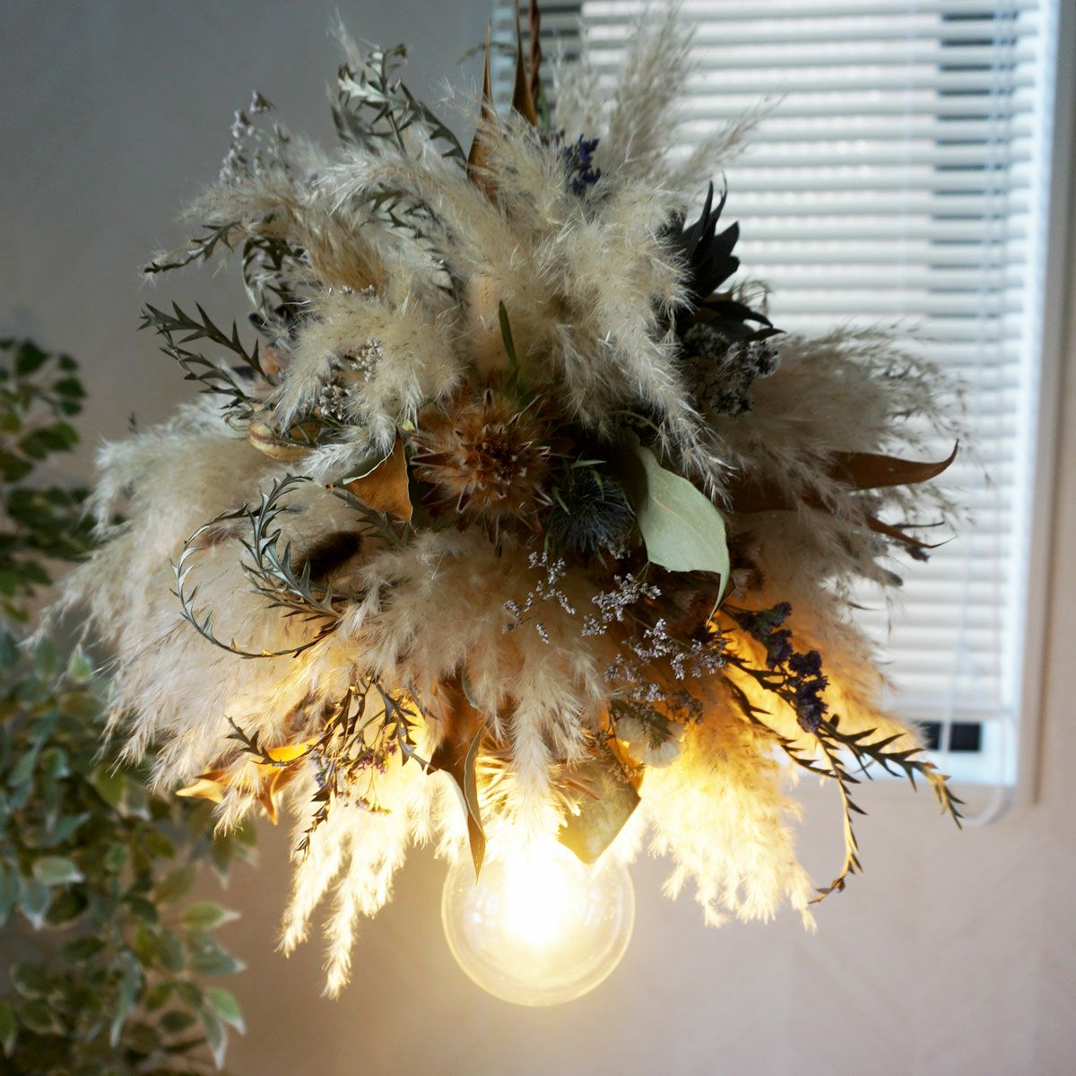 他の画像を見る 【ドライフラワー照明・1灯式ペンダントライト(直径約35cm)】パンパスグラス・ユーカリ<ドーム> 販売価格 ¥ 33,000 税込 サロンやカフェなどの店内装飾・ディスプレイやお部屋のインテリアに。おしゃれなドライフラワーを使ったペンダントライト・照明。開業祝い・開店祝い・新築祝い・プレゼントギフトにもおすすめ。 詳細を見る お気に入りに登録する