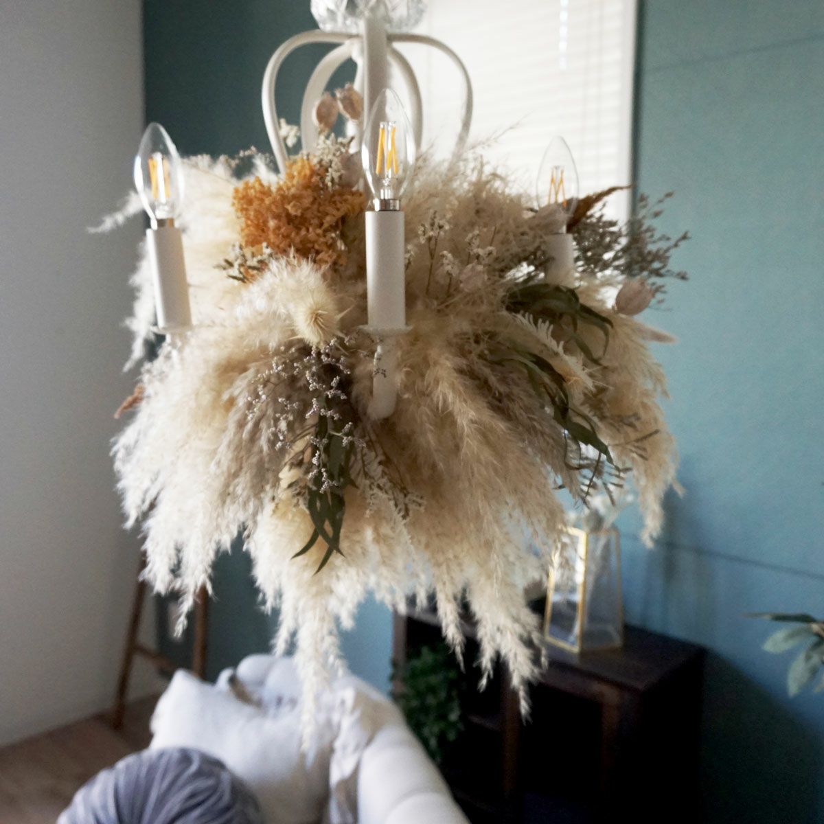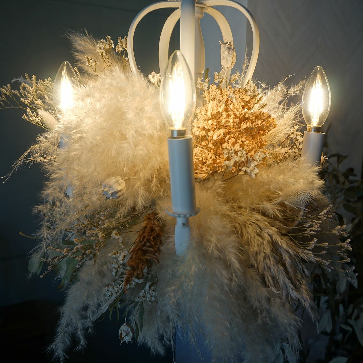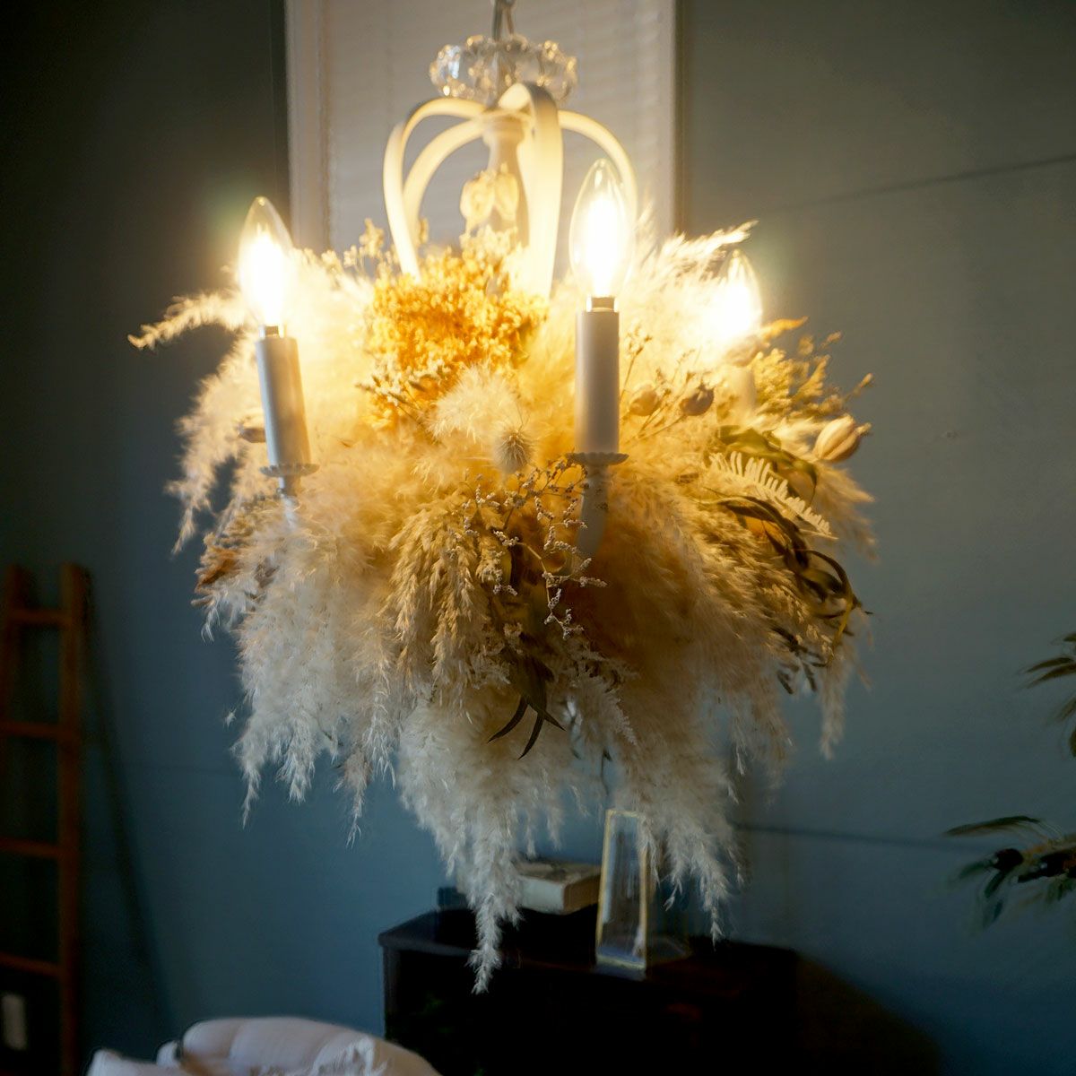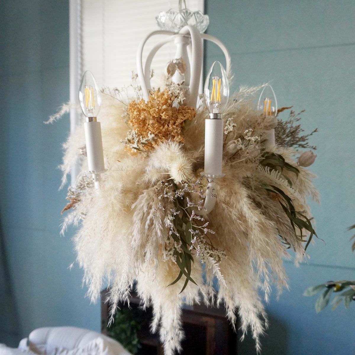 他の画像を見る 【ドライフラワー照明・5灯式シャビーシックシャンデリア(直径約60cm)<アナベラ>】 販売価格 ¥ 82,500 税込 シャンデリアにふわふわなパンパスとドライフラワーをあしらいました。サロンやカフェなどの店内装飾・ディスプレイやお部屋のインテリアに。おしゃれなドライフラワー照明・シャンデリア・ライトは、開店祝いや新築祝い、プレゼントギフトなどにおすすめです。 詳細を見る お気に入りに登録する