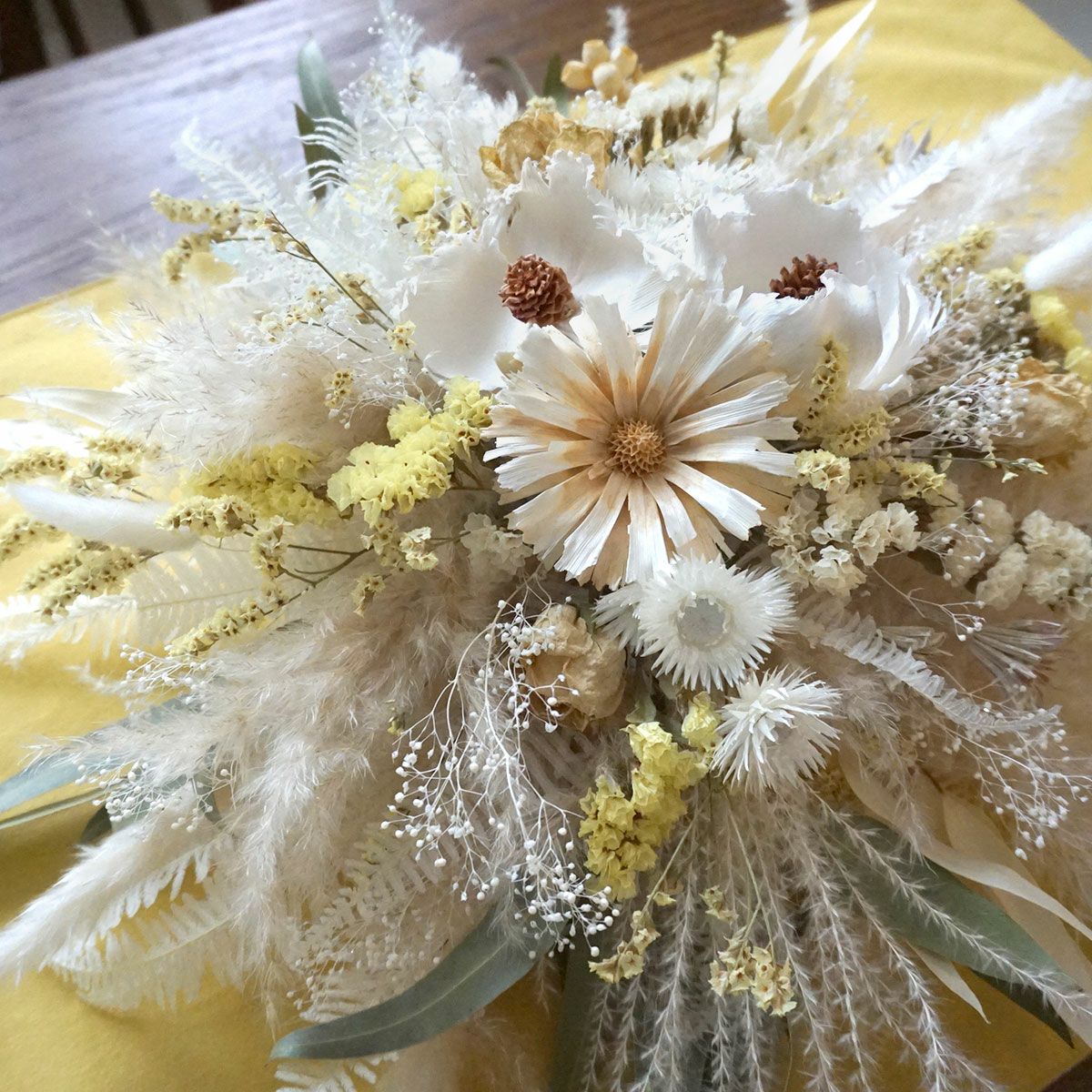 他の画像を見る 【結婚祝いのプレゼントにおすすめ】スターチス・カスミソウ・ユーカリなどを使ったドライフラワースワッグ・花束<ブライト> 販売価格 ¥ 8,800 税込 結婚祝いのプレゼントやギフトにおすすめ。一生に一度の大切なお祝いにドライフラワーを贈りませんか?インテリアにもなる・魅力あふれるお祝いのドライフラワー花束です。こちらのスワッグはイエローやオレンジのスターチス、爽やかなユーカリ、エバーラスティング、カスミソウなどを使ったスワッグです。 ご注文いただいてから1点ずつ商品写真のイメージで丁寧にお作りします。立札やメッセージカードも無料でお付けできます。ぜひお祝いにいかがでしょうか。 詳細を見る お気に入りに登録する