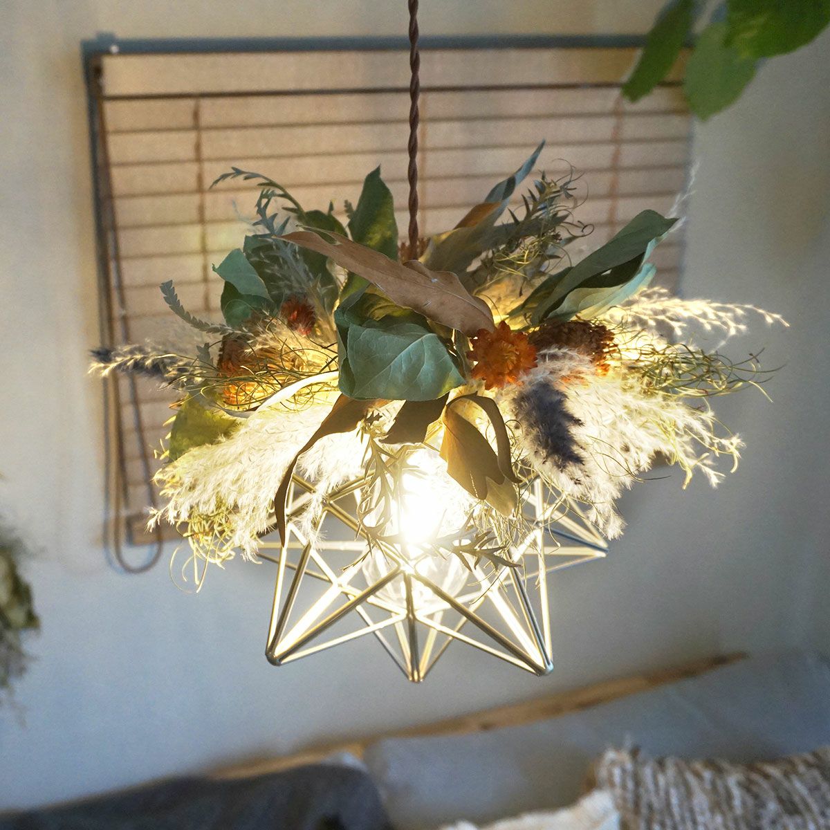 他の画像を見る 【ドライフラワー照明・1灯式星型ペンダントライト(直径約30cm)】パンパスグラス・ドライアンドラ・ヘリクリサム<アース> 販売価格 ¥ 22,000 税込 星の形がかわいい照明!サロンやカフェなどの店内装飾・ディスプレイやお部屋のインテリアに。おしゃれなドライフラワーを使ったペンダントライト・照明 詳細を見る お気に入りに登録する