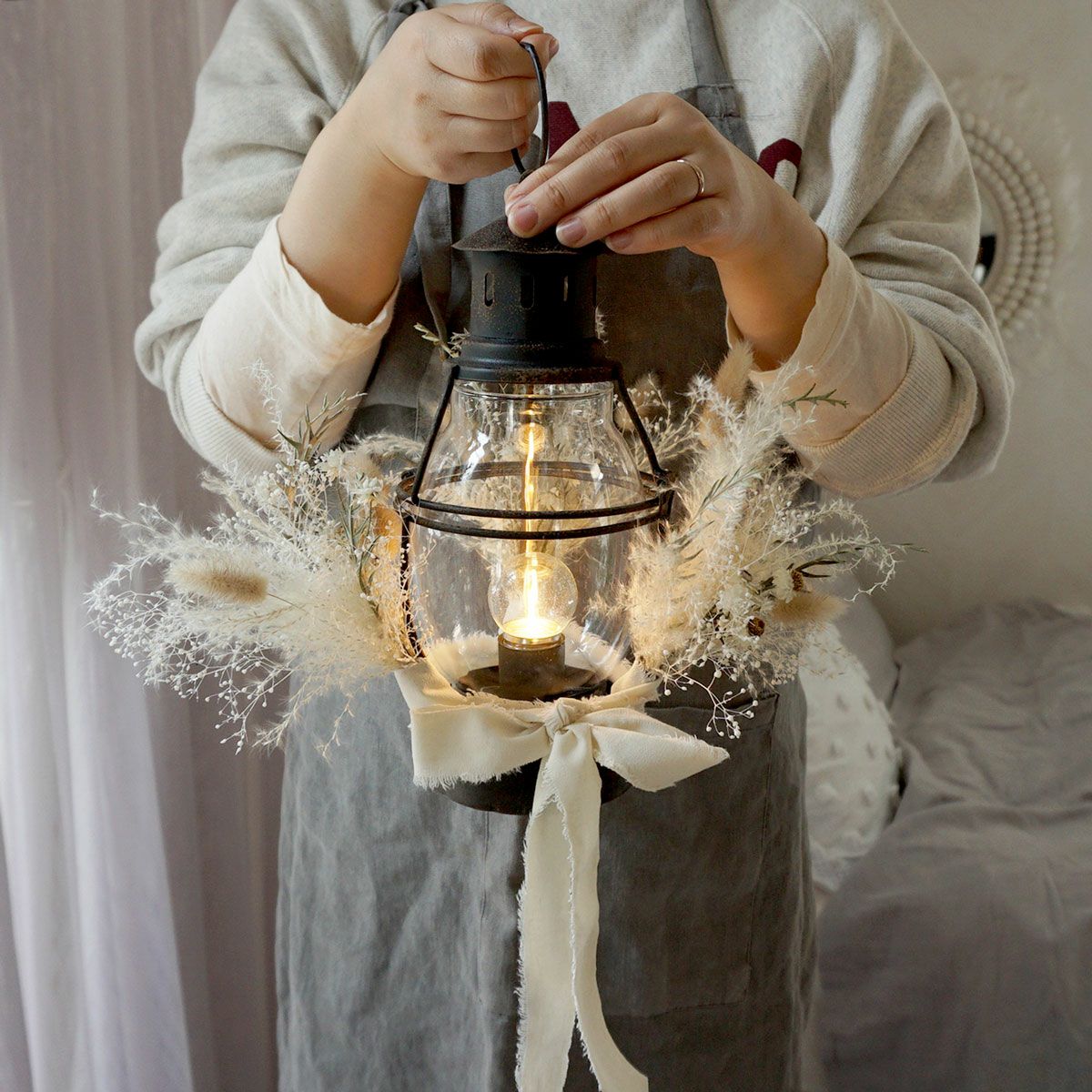 他の画像を見る 【ドライフラワー照明・ランタン(約W33cm)】ソフトカスミソウ・ススキ・ラグラスなどを使用<フローレンス> 販売価格 ¥ 12,100 税込 置くだけでかわいいドライフラワーをあしらったランタン。サロンやカフェなどの店内装飾・ディスプレイやお部屋のインテリアに。おしゃれなドライフラワーを使った照明はプレゼントやギフトにもおすすめです。 詳細を見る お気に入りに登録する