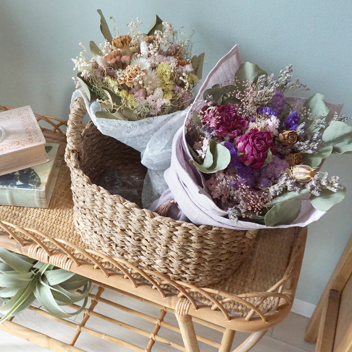 他の画像を見る 開店祝いや結婚祝いなどにおすすめ!カスミソウやユーカリを使ったホワイトカラーのドライフラワーバスケット<ミルキー> 販売価格 ¥ 11,000 税込 開店祝いや誕生日プレゼント、結婚祝いにおすすめな直径約20cmのドライフラワーバスケット。バスケット内の生地もお好みのものをお選びいただけます。お写真と同じデザインの生地を希望の場合は「お花のイメージでスタッフにおまかせする」をご選択ください。ドライフラワーバスケットは置くだけでインテリアになるので、簡単にお花をお楽しみいただけます。無料でクリアフィルムラッピングもしていますので、ぜひプレゼントにご検討くださいませ。 詳細を見る お気に入りに登録する
