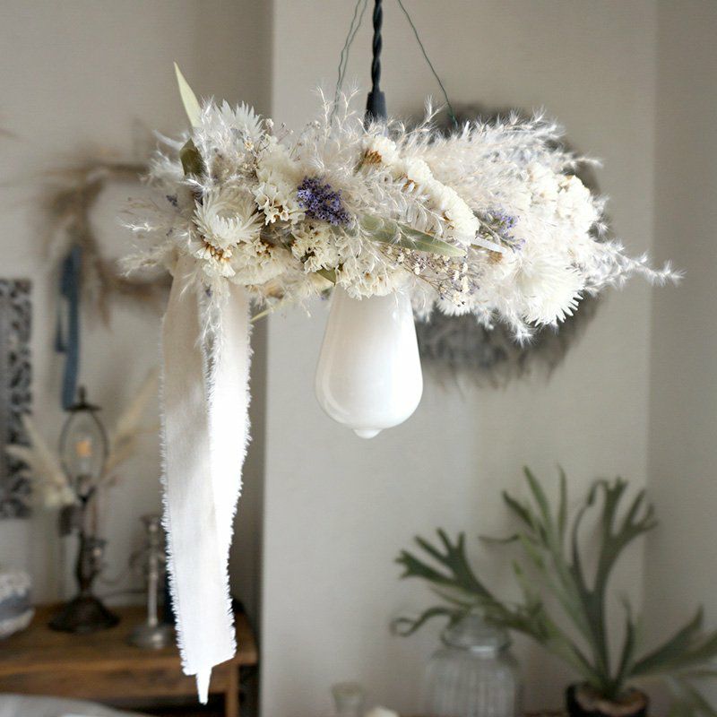 パンパスグラスがふわふわでかわいいフライングリースの照明。サロンやカフェなどの店内装飾・ディスプレイやお部屋のインテリアに。おしゃれなドライフラワー照明・シャンデリア・ライトは、開店祝いや新築祝い、プレゼントギフトなどにおすすめです。