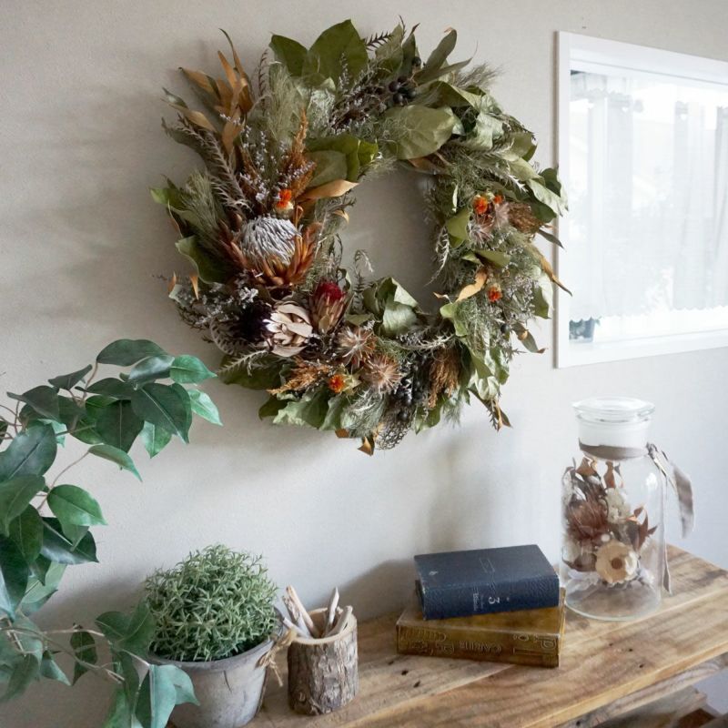 FLOWER:キングプロテア、プロテア、リューカデンドロン、ケイトウ、ブラックベリー、ゴアナクロー、ハイブリットスタチス、グレビアゴールド、グレビレアアイバン穂、ベニバナ、コアラファン、レモンリーフなど。