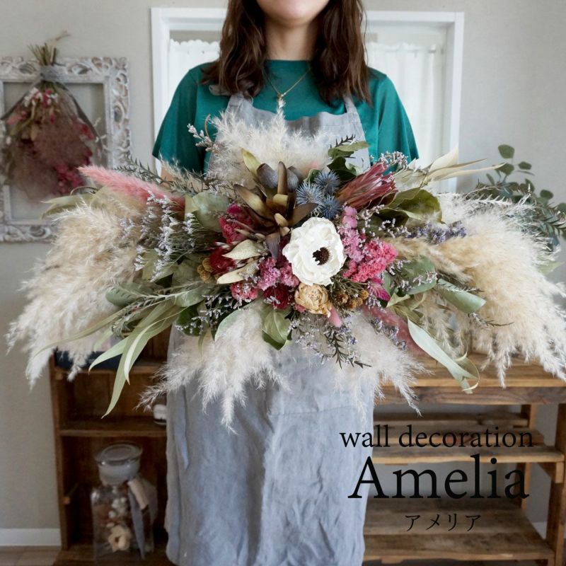 パンパスグラスとピンクのお花がアクセントの大人可愛い壁飾りです。