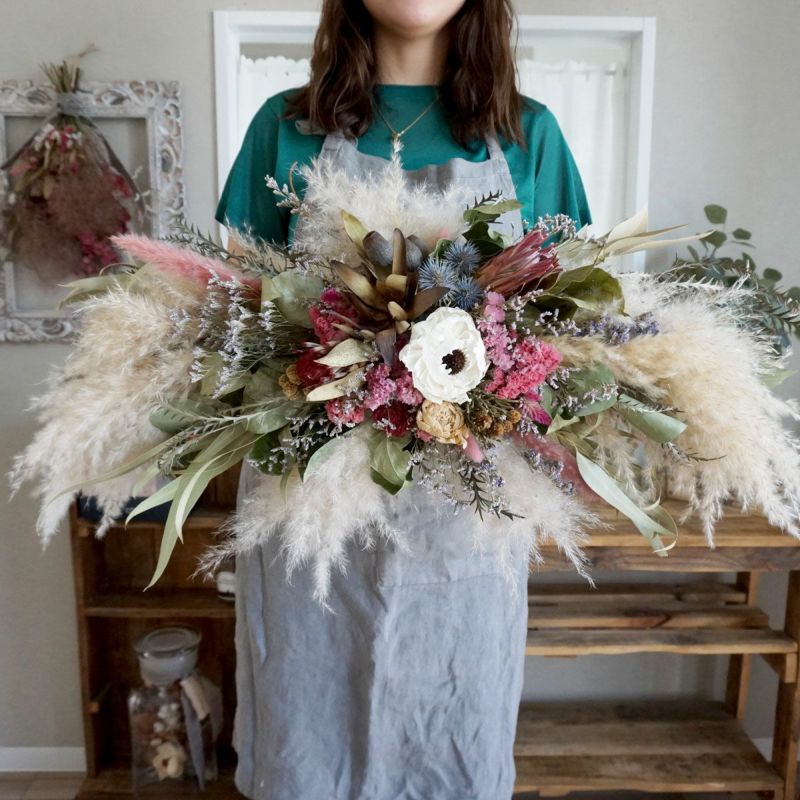 MATERIAL:ソーラーシャクヤク、リューカデンドロン、プロテア、ネベリア、シャクヤク、ローズ、エリンジウム、ハイブリットスターチス、スターチス2色、ロードテール、パンパスグラス、ユーカリなど。