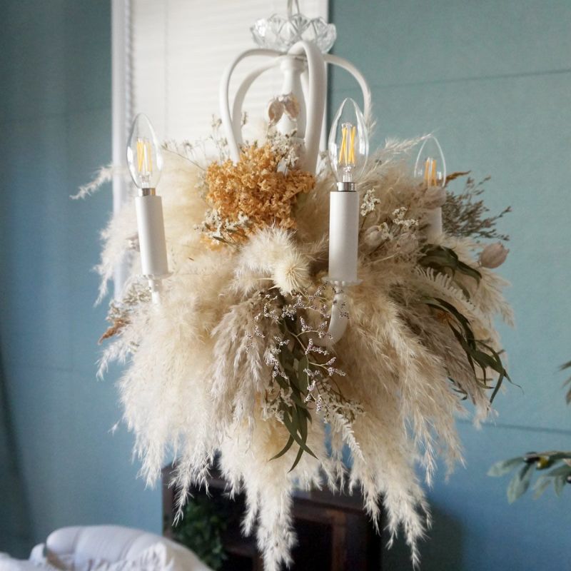 シャンデリアにふわふわなパンパスとドライフラワーをあしらいました。サロンやカフェなどの店内装飾・ディスプレイやお部屋のインテリアに。おしゃれなドライフラワー照明・シャンデリア・ライトは、開店祝いや新築祝い、プレゼントギフトなどにおすすめです。