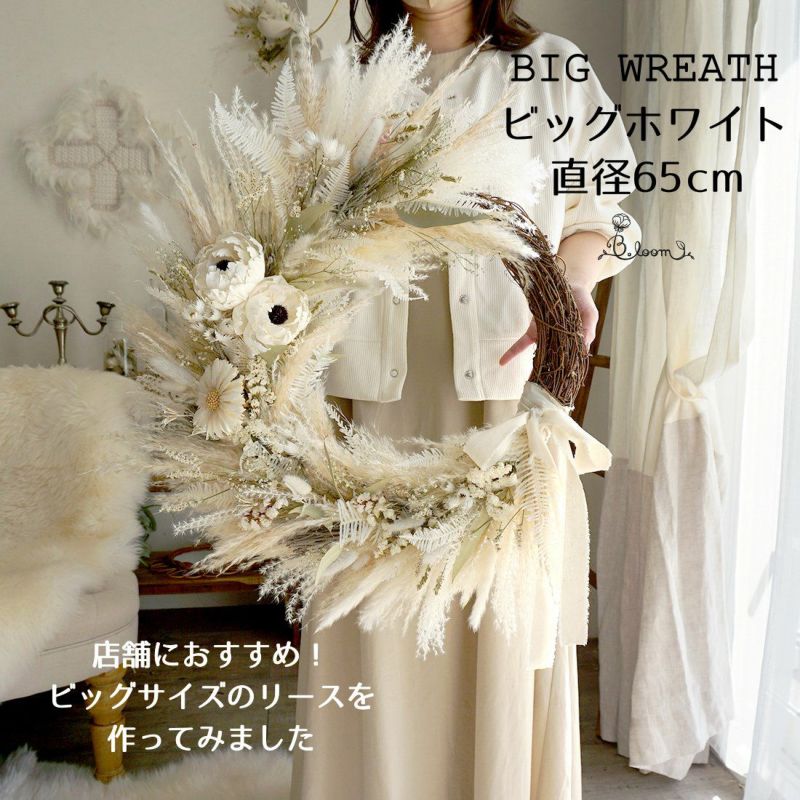 パンパスグラス、ユーカリでお作りしたホワイトカラーベースのシャビーシックなビッグサイズリースです。サロンや店舗にもおすすめです。ドライフラワーはたっぷりでボリューミーに仕上げました。