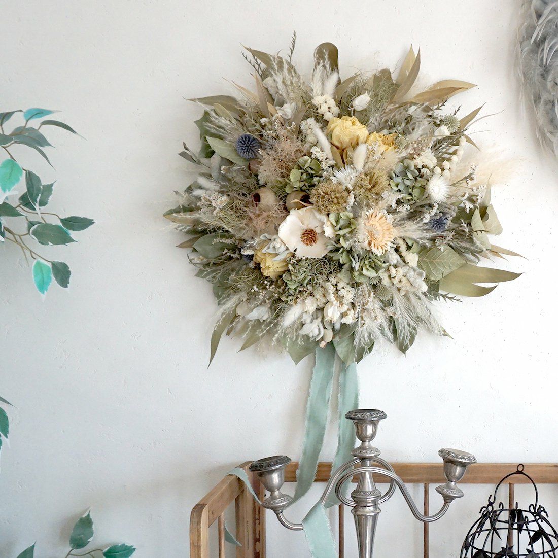 他の画像を見る 【シャビーシック】豪華・キングプロテアやパンパスグラス、ユーカリやアジサイなどのドライフラワーをたっぷり使ったおしゃれなウォールデコレーション<SANCTUARY -サンクチュアリ-> 販売価格 ¥ 20,900 税込 豪華なワイルドフラワーのドライフラワーを使ったナチュラルなウォールデコレーション。店舗の内装にもおすすめの装花です。開店祝い・引っ越し祝いにもおすすめ。 詳細を見る お気に入りに登録する