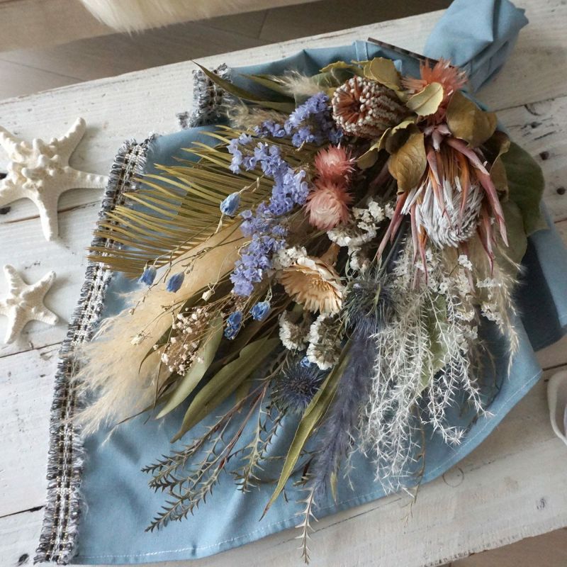MATERIAL:キングプロテア、スターチス、ユーカリ、ソテツ、カスミソウ、エリンジウム、バンクシアココネシアなど