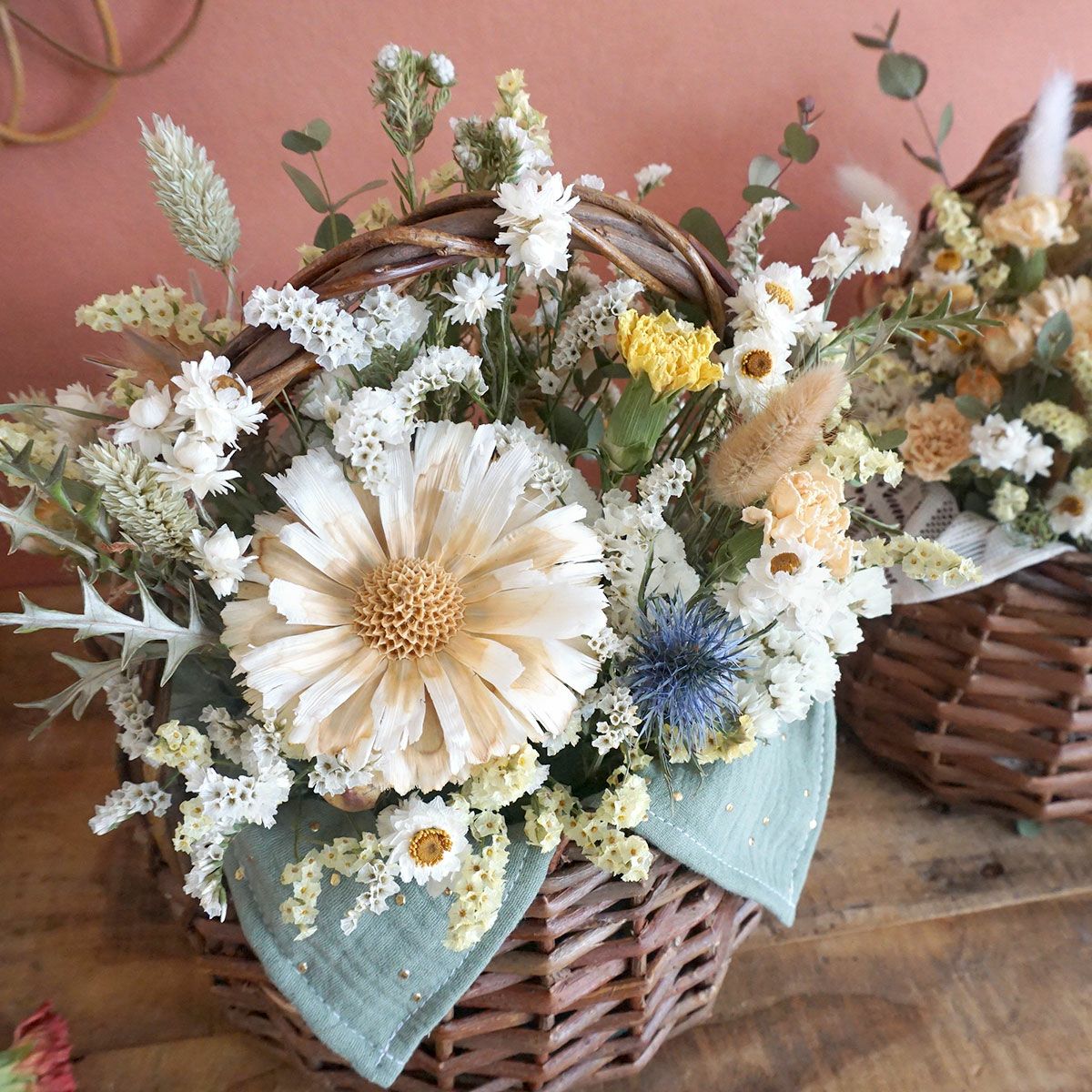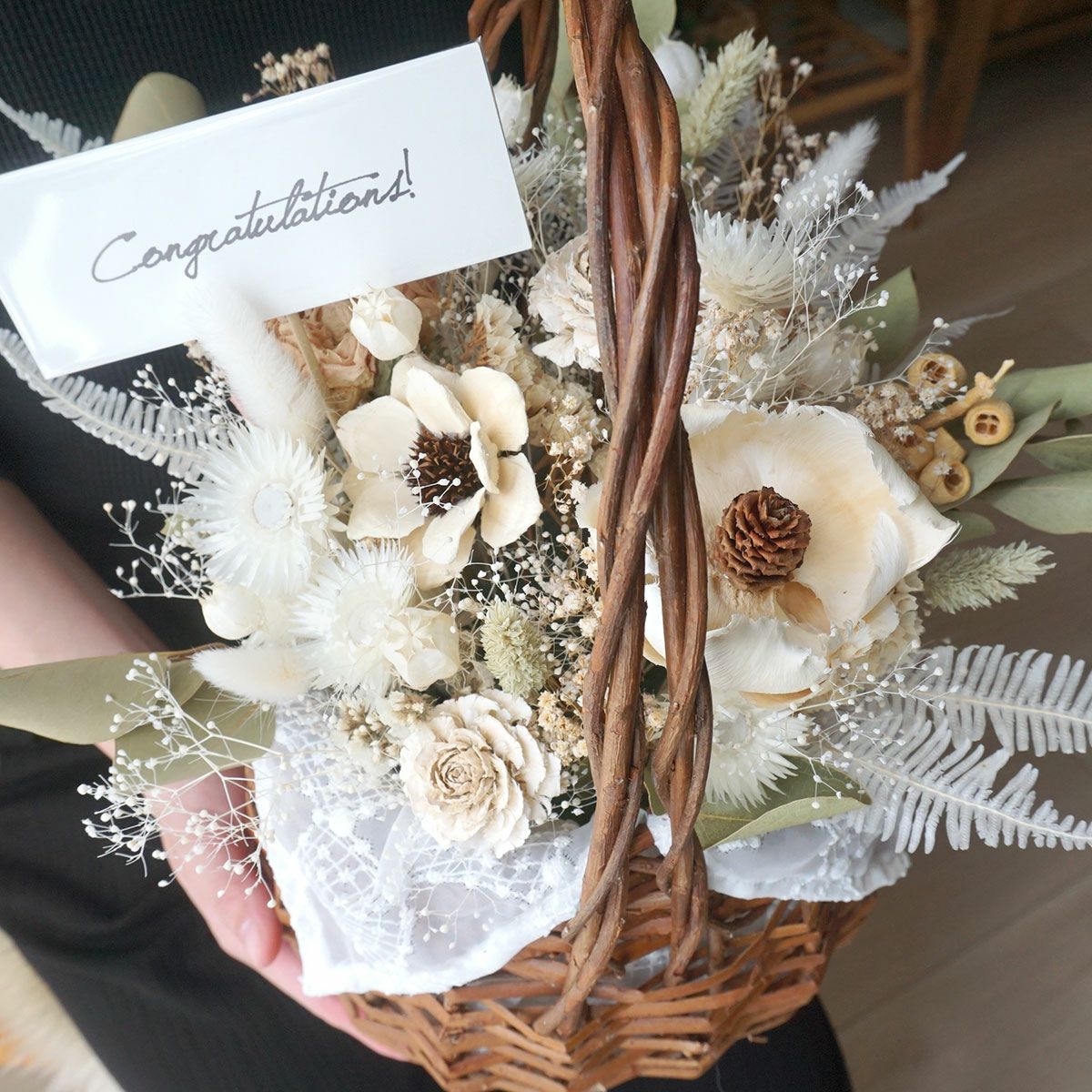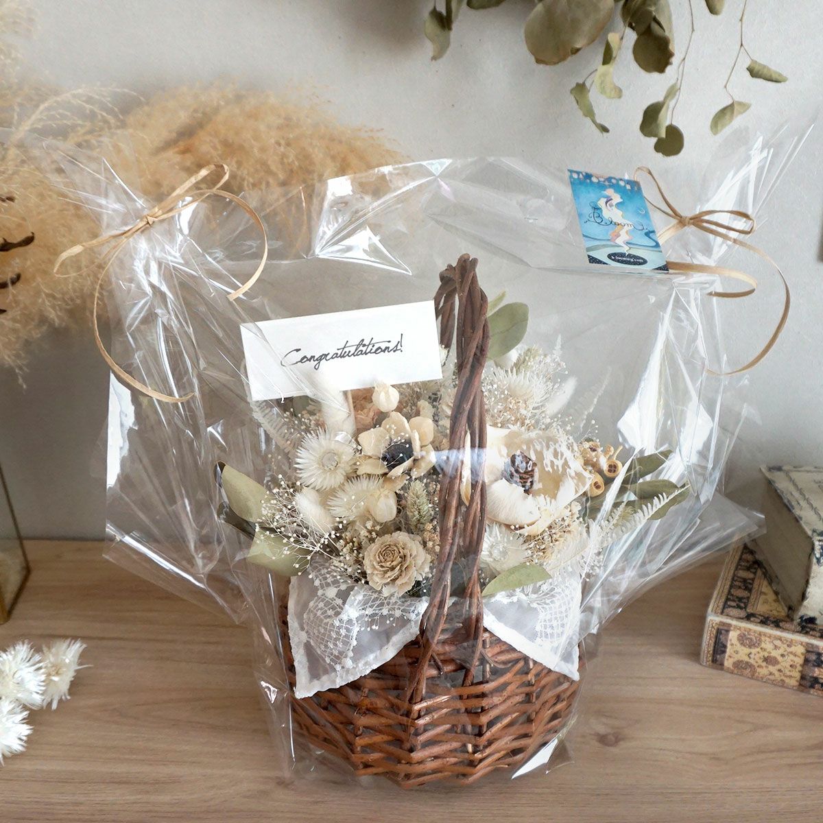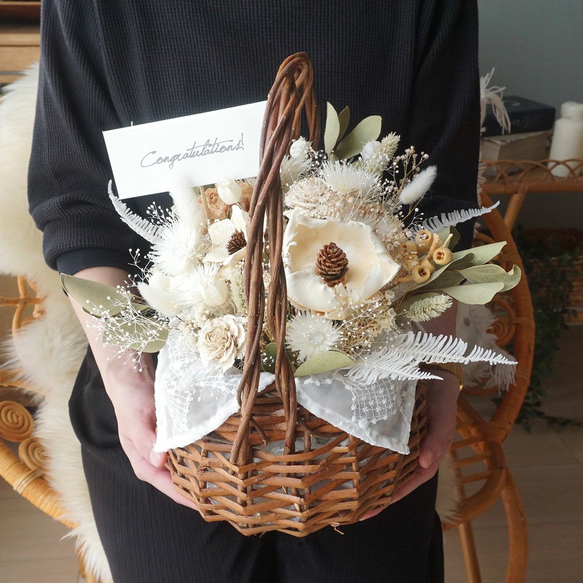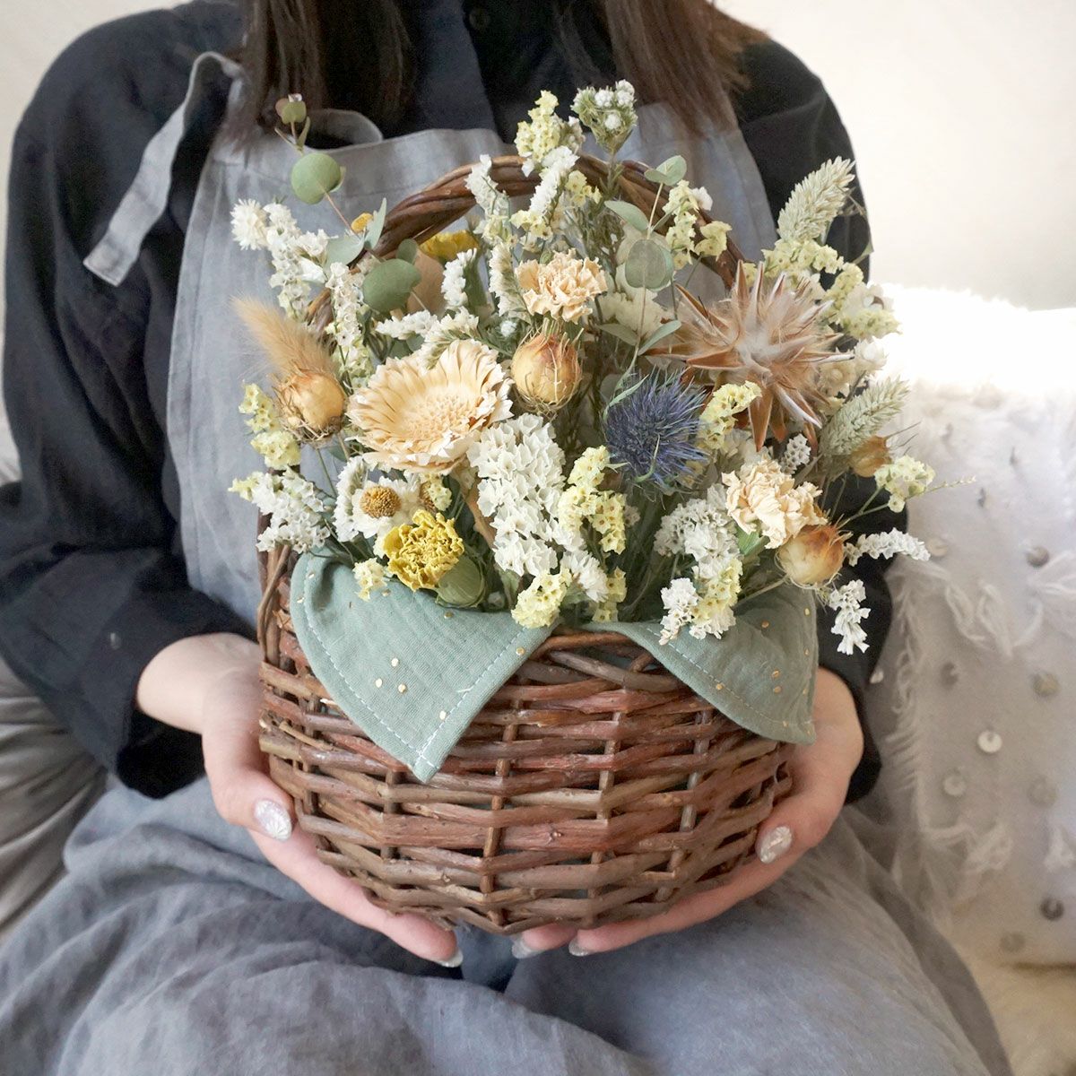 他の画像を見る 開店祝いや結婚祝いなどにおすすめ!カスミソウやユーカリを使ったホワイトカラーのドライフラワーバスケット<ミルキー> 販売価格 ¥ 11,000 税込 開店祝いや誕生日プレゼント、結婚祝いにおすすめな直径約20cmのドライフラワーバスケット。バスケット内の生地もお好みのものをお選びいただけます。お写真と同じデザインの生地を希望の場合は「お花のイメージでスタッフにおまかせする」をご選択ください。ドライフラワーバスケットは置くだけでインテリアになるので、簡単にお花をお楽しみいただけます。無料でクリアフィルムラッピングもしていますので、ぜひプレゼントにご検討くださいませ。 詳細を見る お気に入りに登録する