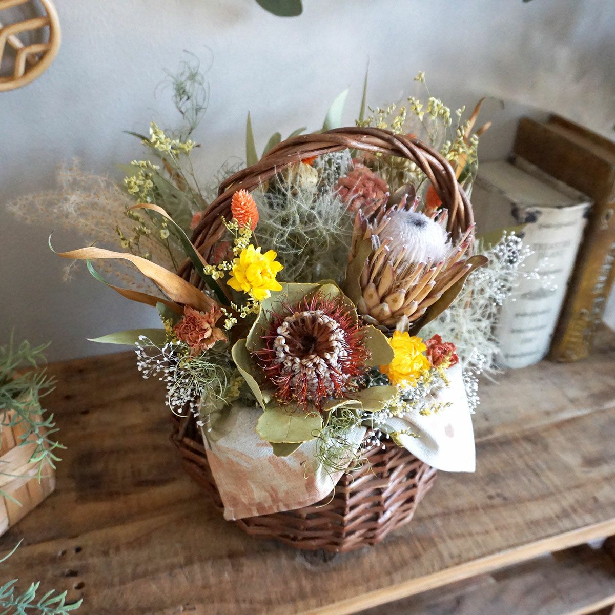 他の画像を見る 開店祝いや結婚祝いなどにおすすめ!スモークツリーやプロテアを使ったドライフラワーバスケット<スパイス> 販売価格 ¥ 11,000 税込 開店祝いや誕生日プレゼント、結婚祝いにおすすめな直径約20cmのドライフラワーバスケット。バスケット内の生地もお好みのものをお選びいただけます。お写真と同じデザインの生地を希望の場合は「お花のイメージでスタッフにおまかせする」をご選択ください。ドライフラワーバスケットは置くだけでインテリアになるので、簡単にお花をお楽しみいただけます。無料でクリアフィルムラッピングもしていますので、ぜひプレゼントにご検討くださいませ。 詳細を見る お気に入りに登録する