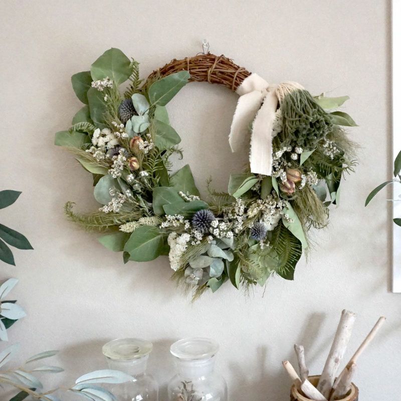 ユーカリやエリンジウム、スターチスなどを使ったリース(ウォールデコレーション)です。