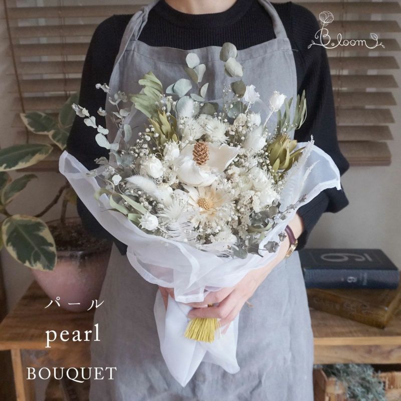 【結婚祝いにおすすめ】結婚祝いや出産祝いにオススメのホワイトメインのウェディングブーケ<パール>真っ白な花束が純白の花嫁のように可愛らしいブーケです。グリーンと合わせておりますのでナチュラルな雰囲気がお好きな方にもおすすめです。