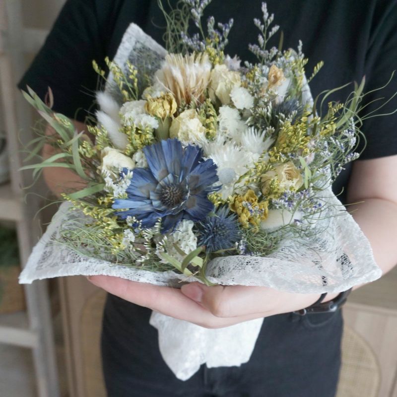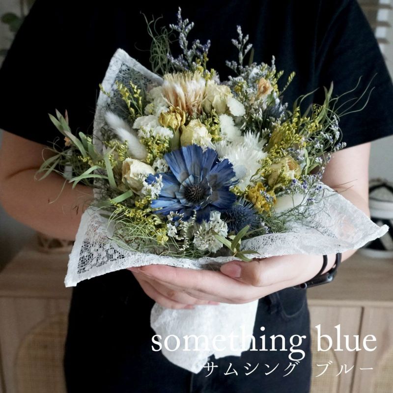 大切な人が幸せになりますようにと願いをこめたサムシングブルーの花束です。