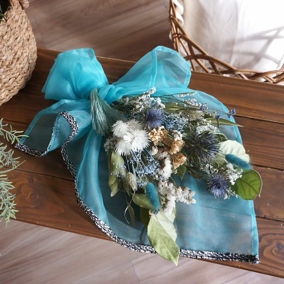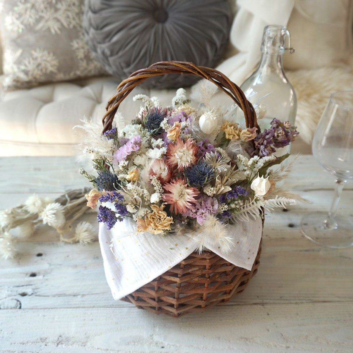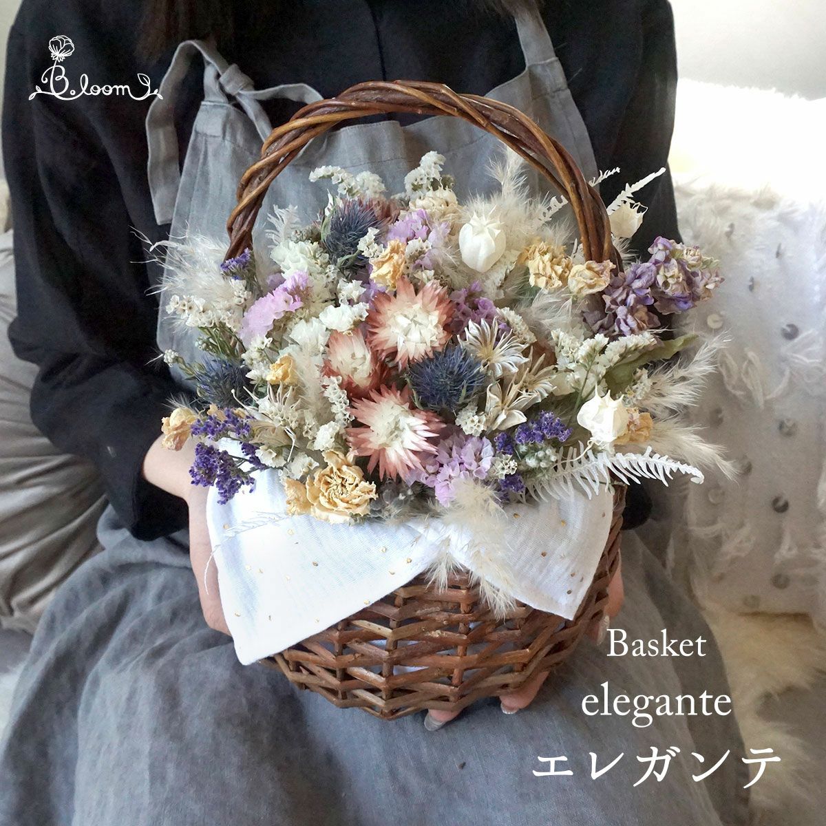 他の画像を見る 開店祝いや結婚祝いなどにおすすめ!カスミソウやユーカリを使ったホワイトカラーのドライフラワーバスケット<ミルキー> 販売価格 ¥ 11,000 税込 開店祝いや誕生日プレゼント、結婚祝いにおすすめな直径約20cmのドライフラワーバスケット。バスケット内の生地もお好みのものをお選びいただけます。お写真と同じデザインの生地を希望の場合は「お花のイメージでスタッフにおまかせする」をご選択ください。ドライフラワーバスケットは置くだけでインテリアになるので、簡単にお花をお楽しみいただけます。無料でクリアフィルムラッピングもしていますので、ぜひプレゼントにご検討くださいませ。 詳細を見る お気に入りに登録する
