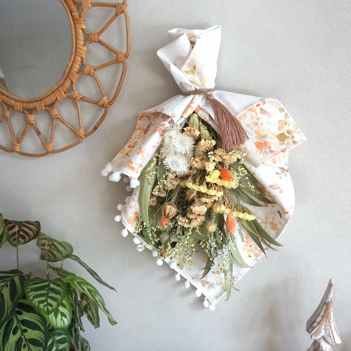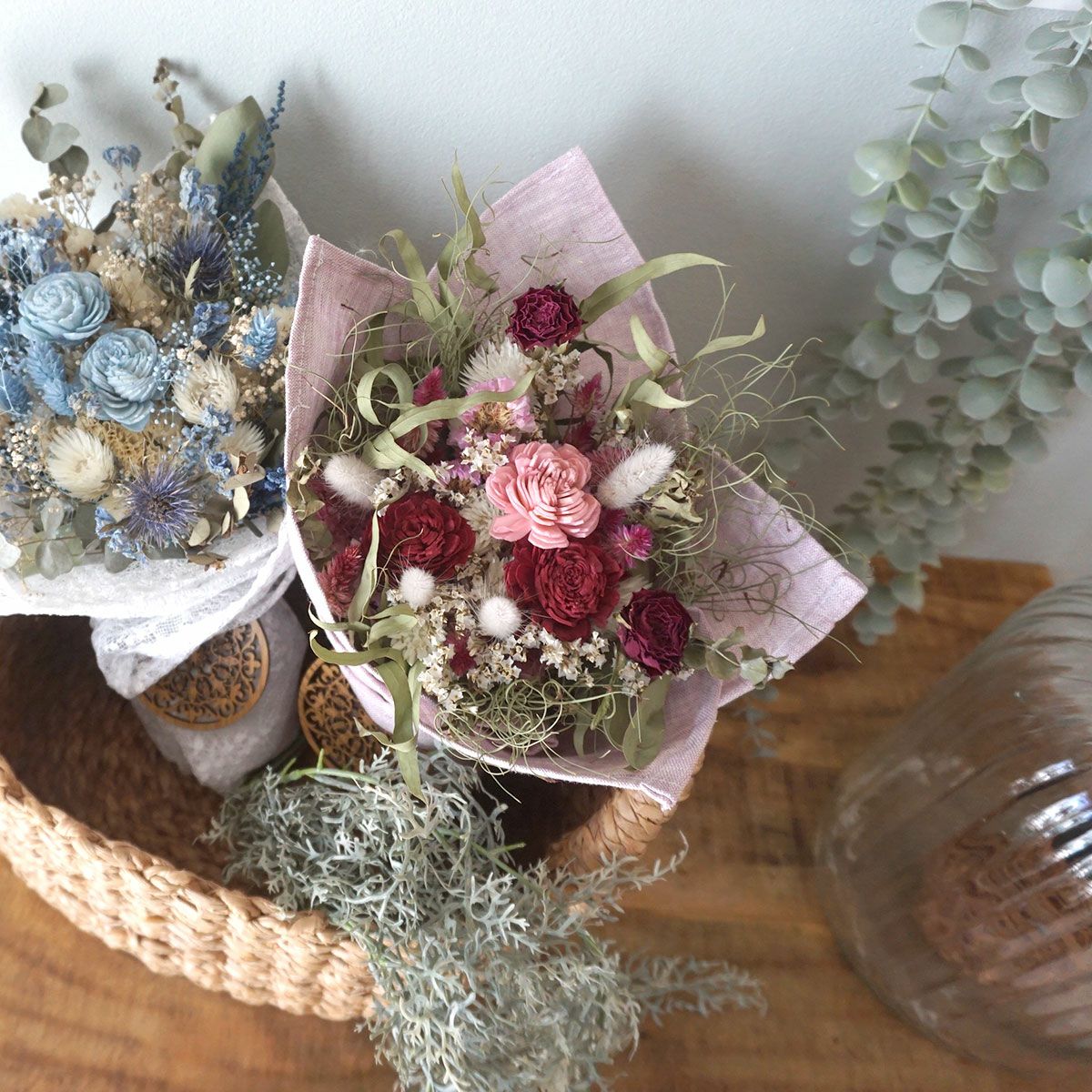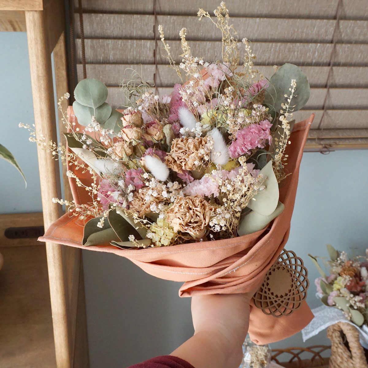 他の画像を見る 開店祝いや結婚祝いなどにおすすめ!カスミソウやユーカリを使ったホワイトカラーのドライフラワーバスケット<ミルキー> 販売価格 ¥ 11,000 税込 開店祝いや誕生日プレゼント、結婚祝いにおすすめな直径約20cmのドライフラワーバスケット。バスケット内の生地もお好みのものをお選びいただけます。お写真と同じデザインの生地を希望の場合は「お花のイメージでスタッフにおまかせする」をご選択ください。ドライフラワーバスケットは置くだけでインテリアになるので、簡単にお花をお楽しみいただけます。無料でクリアフィルムラッピングもしていますので、ぜひプレゼントにご検討くださいませ。 詳細を見る お気に入りに登録する