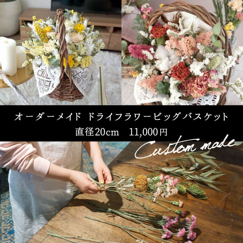 世界に一つだけのドライフラワーバスケットアレンジ。サイズが大きくなって、お祝いにぴったり!お客様のご希望に合わせてお作りします。配送前に写真もお送りしているので、直送のプレゼントでも安心です。誕生日・開店祝い・引っ越し祝い・結婚祝い・記念日のお祝いにもおすすめ!