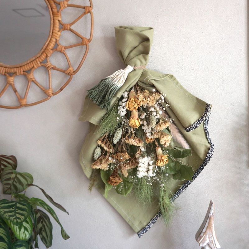 気花束を生地、ブレード、チャーム、巻き方などをお客様のお好みに合わせてアレンジ可能。