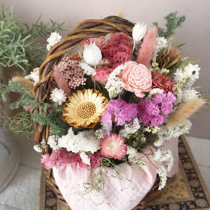 開店祝いや誕生日プレゼント、結婚祝いにおすすめなドライフラワーバスケット。バスケット内の生地もお好みのものをお選びいただけます。ドライフラワーバスケットは置くだけでインテリアになるので、簡単にお花をお楽しみいただけます。無料でクリアフィルムラッピングもしていますので、ぜひプレゼントにご検討くださいませ。