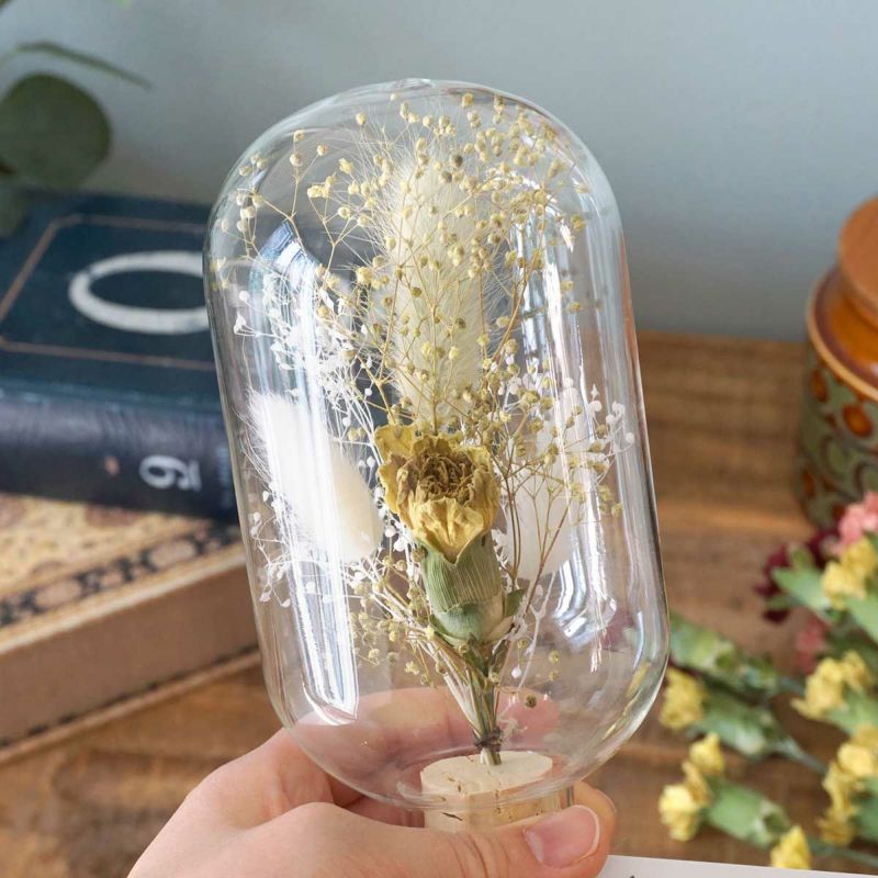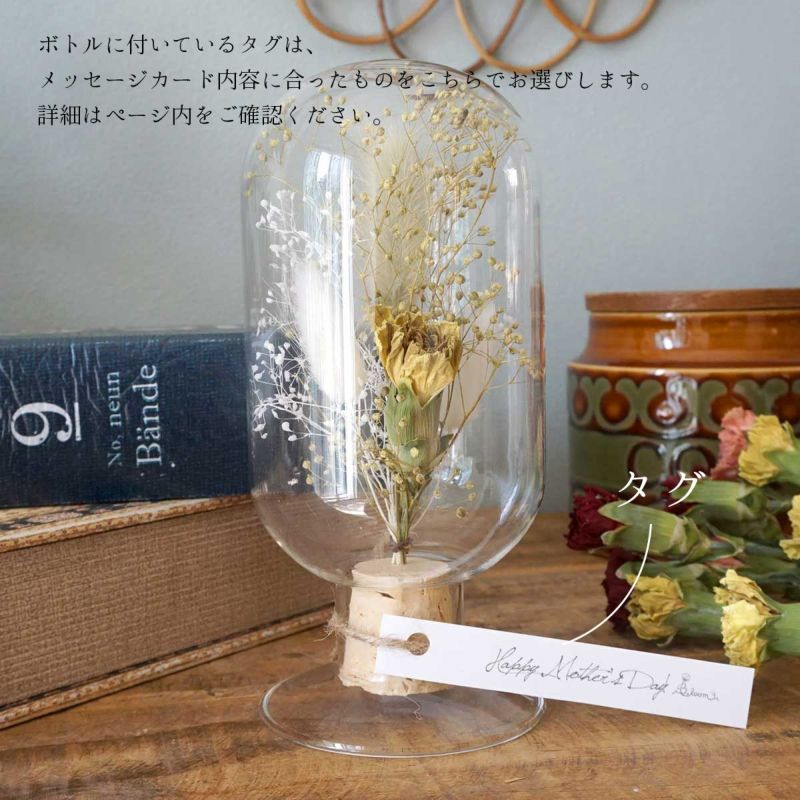 ガラスボトルの中に当店で生花からドライフラワーに加工したカーネーションやソフトカスミソウ、ラグラスを入れました。ボトルなので置いていただくだけで、簡単に飾っていただけます。散りにくいのでお手入れも簡単です。親しい友人や恋人、ご家族へ気持ちを込めたプレゼントにいかがでしょうか?